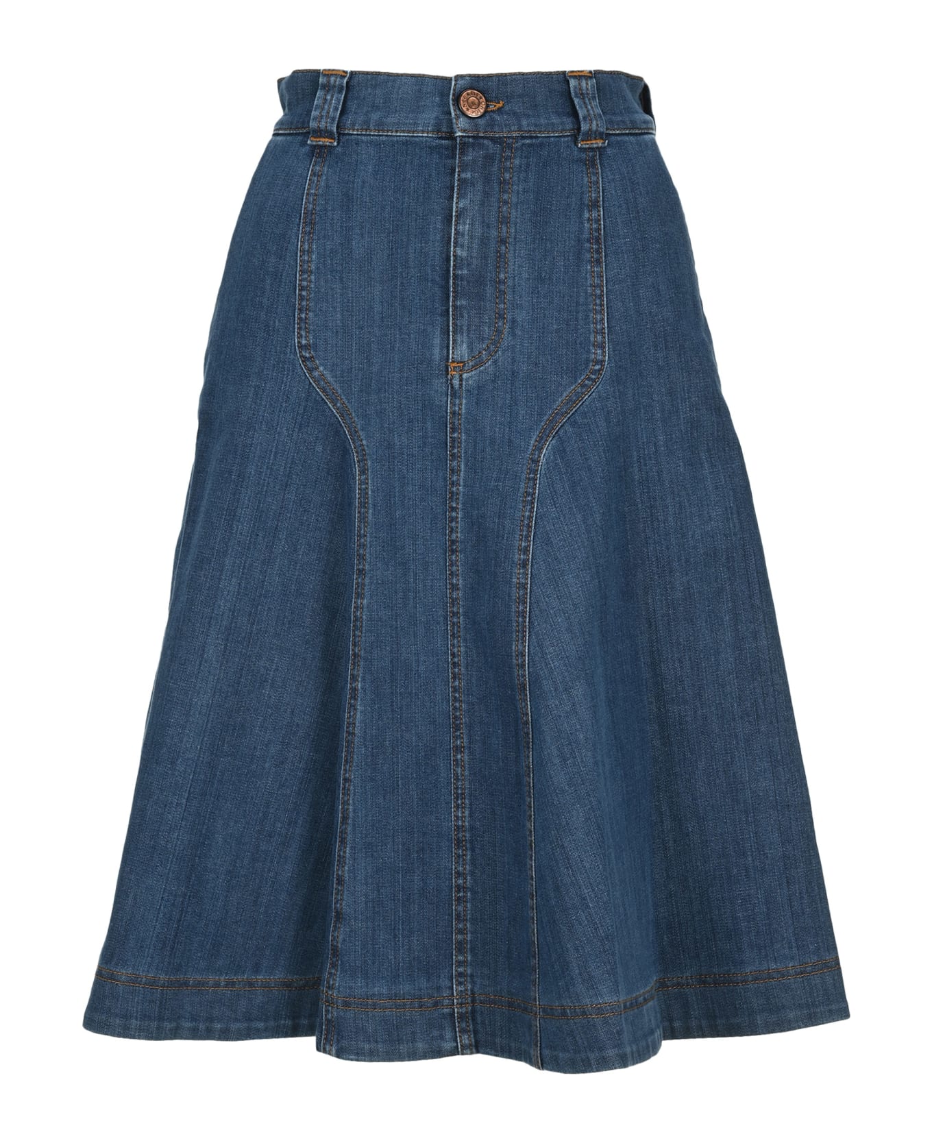 Deep Blue Cotton Blend Flared Denim Skirt By See By Chloé. Featuring: - Button And Zip Fly; - Belt Loops; - Side Slit Pockets; - Rear Patch Pockets; - Flared Design; - Mid-length.