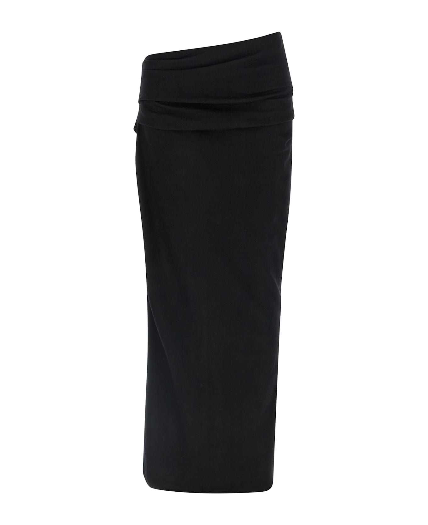 Midi skirt in stretch wool, draping and side zip closure, asymmetrical waist, back split.