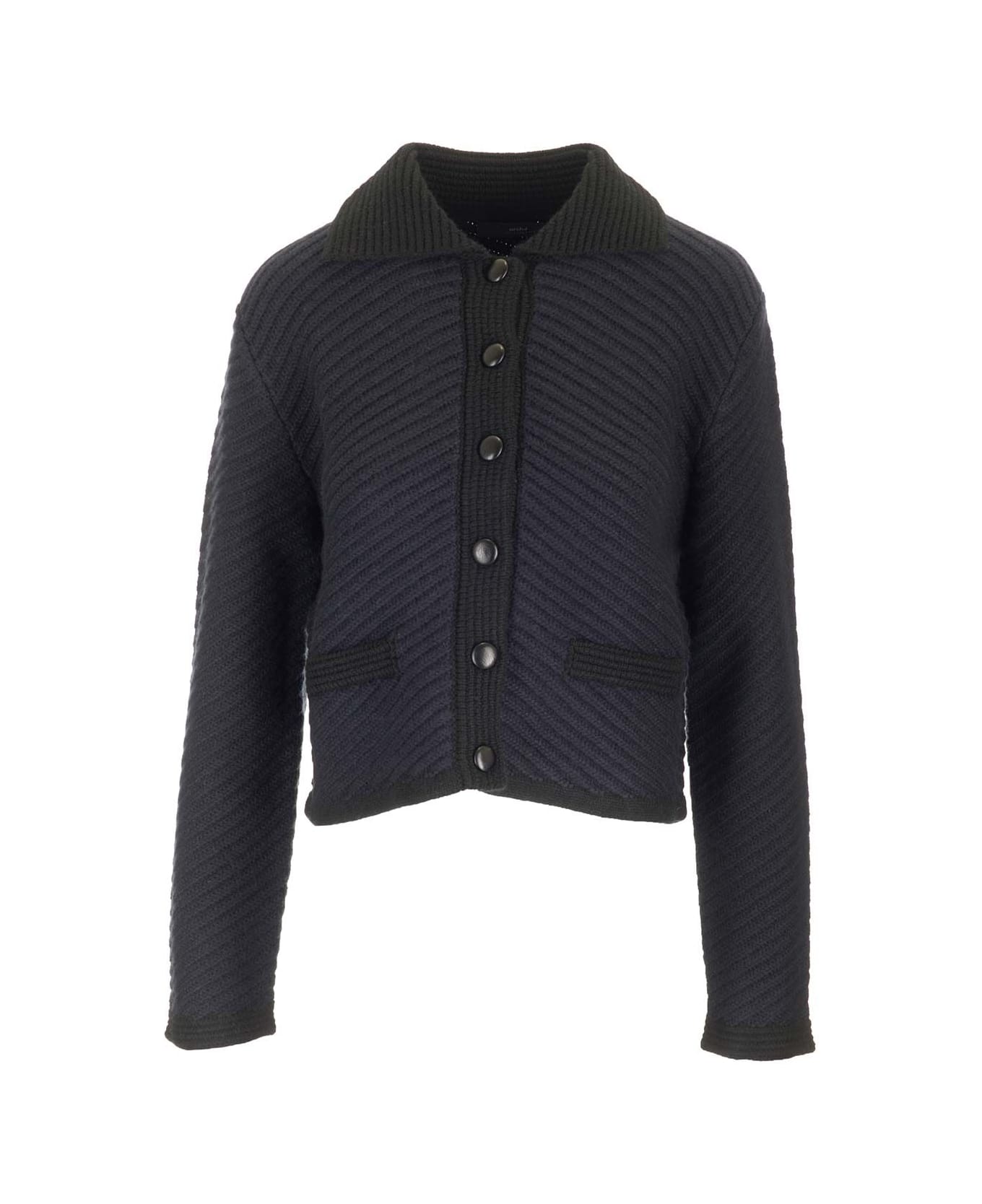 Blue cashmere "Tito" cardigan with front buttons and ribbed shirt-style collar.