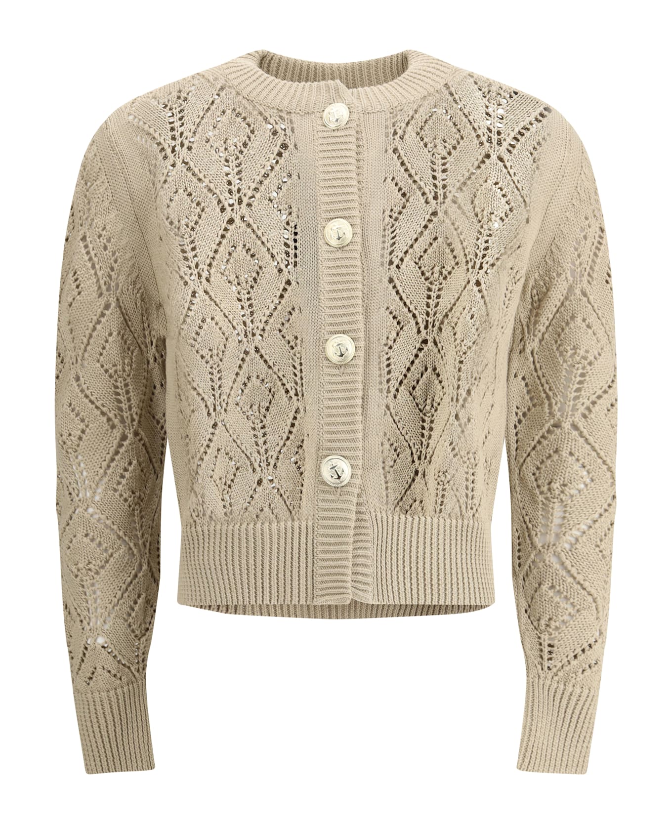 Ella's linen koreakina cardigan is an elegant and versatile piece featuring an embossed button front closure and a ribbed crew neck that accentuate its refined style. ribbed cuffs and hem add a touch of comfort and structure, while the knit design lends a rich, sophisticated texture. perfect for completing a casual-chic look, it is ideal for any season.