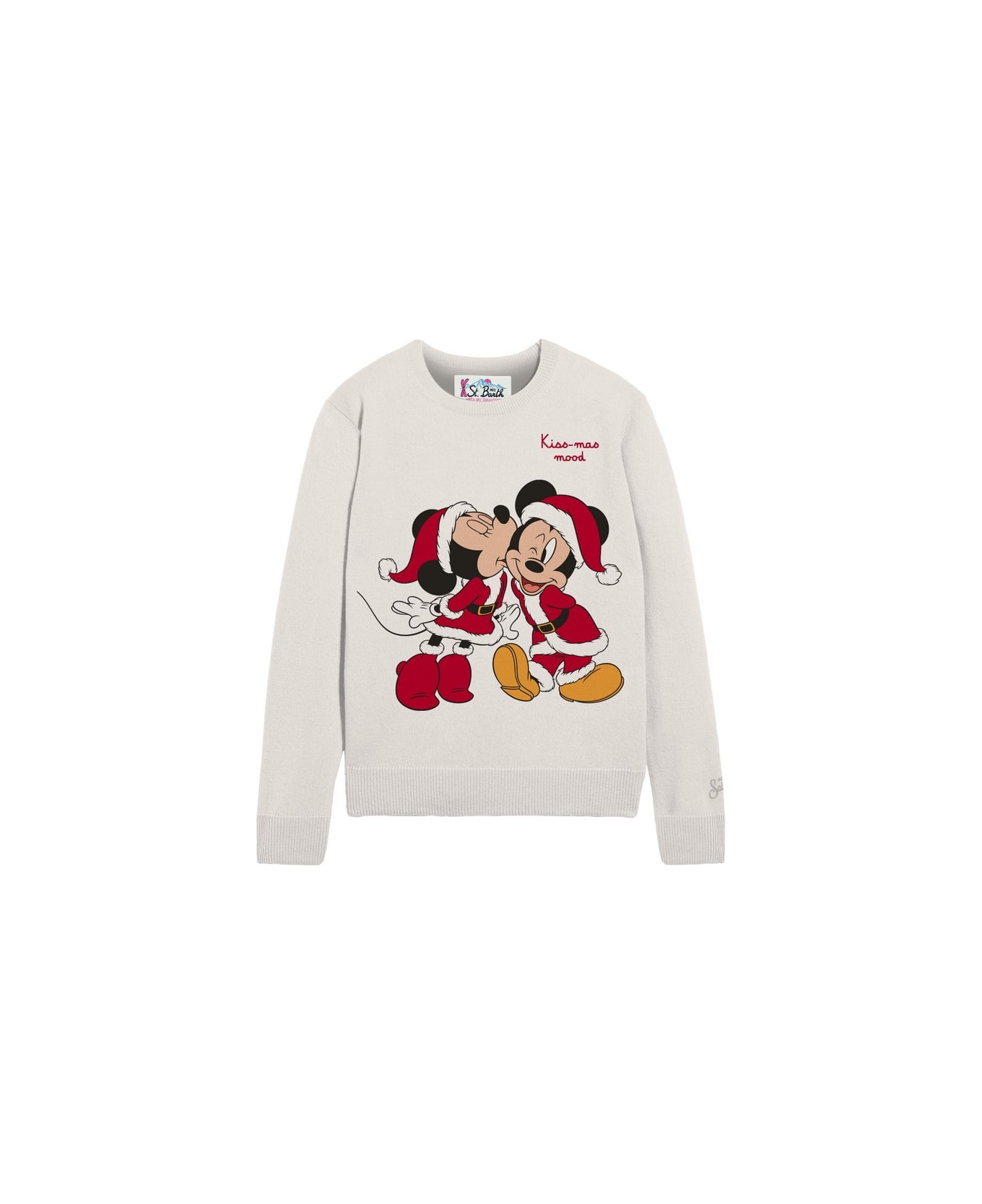 Pull donna con stampa bianco girocollo, con stampa kiss minnie, collo fondo e polsini a coste. Composizione: 35% Lana 30% Viscosa 20% Cashmere 15% Poliammide