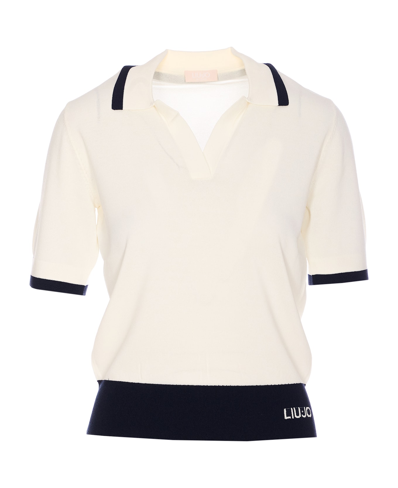 Liu Jo white musk shirt, v-neck, short slevees, regular collar, embroidered logo on the front Composition: 63% Viscose, 37% Polyamide
