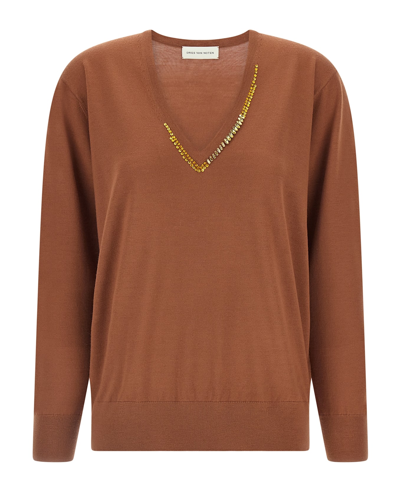 'Tuomas' sweater in light merino wool, V-neck with crystal application, long sleeves with cuffs and dropped shoulder, band on the hem.