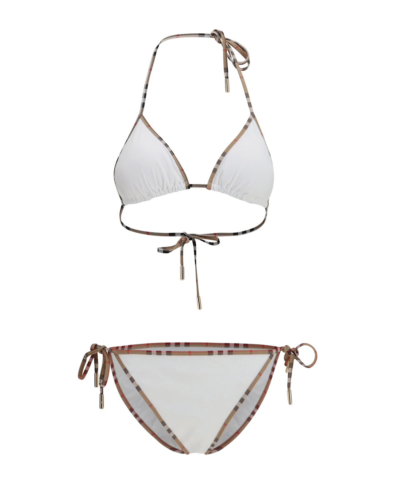 The check detail triangle bikini by burberry is defined by the signature check pattern that reflects the identity of the brand. it features a halter neck tie fastening, removable padded cups and bottoms with adjustable side ties. the clean design enhances the silhouette with a distinctive and modern burberry attitude. Composition: 71% % Polyamide, 29% % Elastane