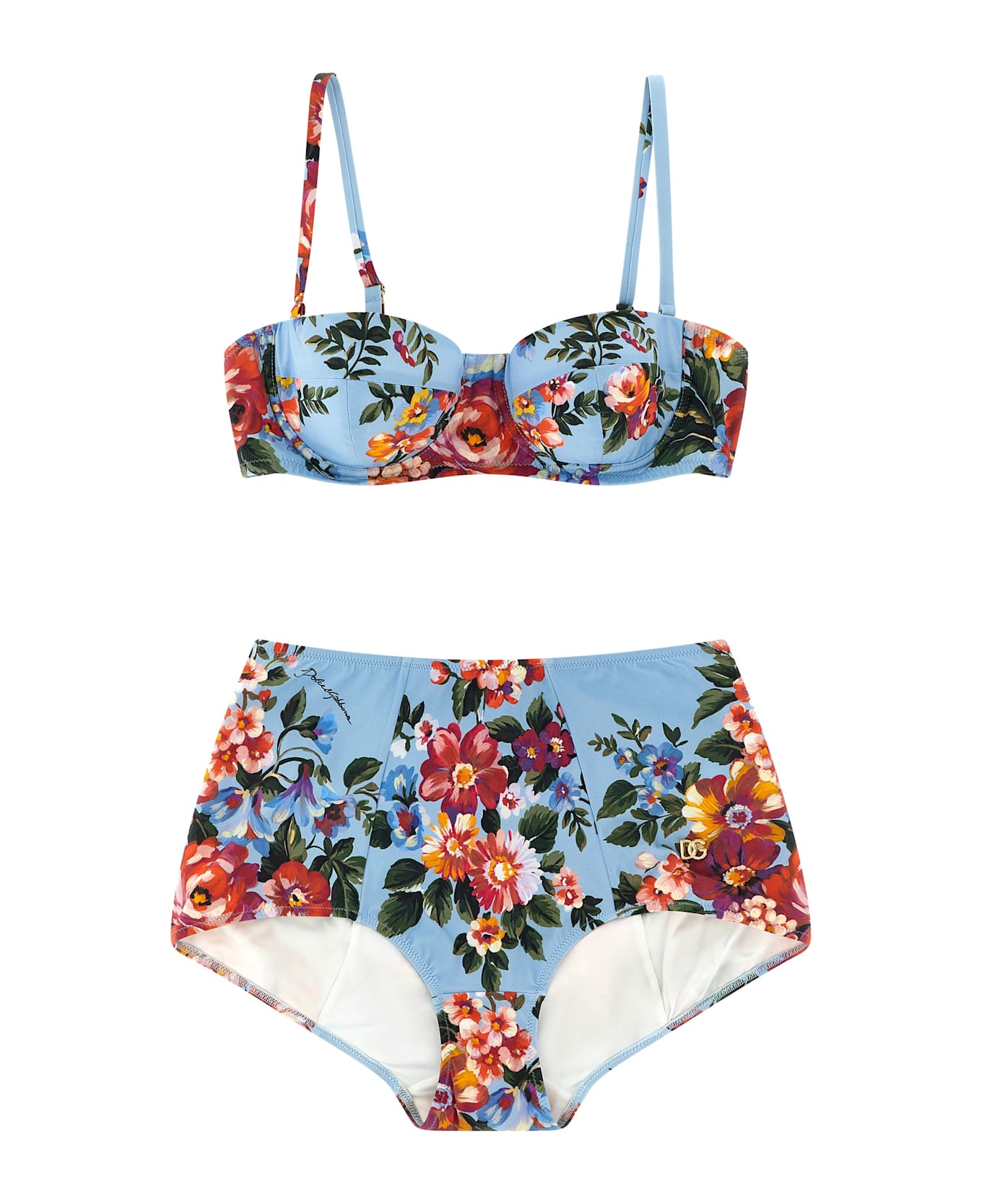 'Re-Edition 2000' all-over flower print Lycra bikini consisting of a balcony top with padded cups and underwire, back logo hook closure, thin adjustable and removable straps, and high waist culotte-style briefs. The differences in print placement you might find on this product is a characteristic of Dolce&Gabbana's Handmade products. A peculiarity that makes each garment or accessory unique and exclusive.