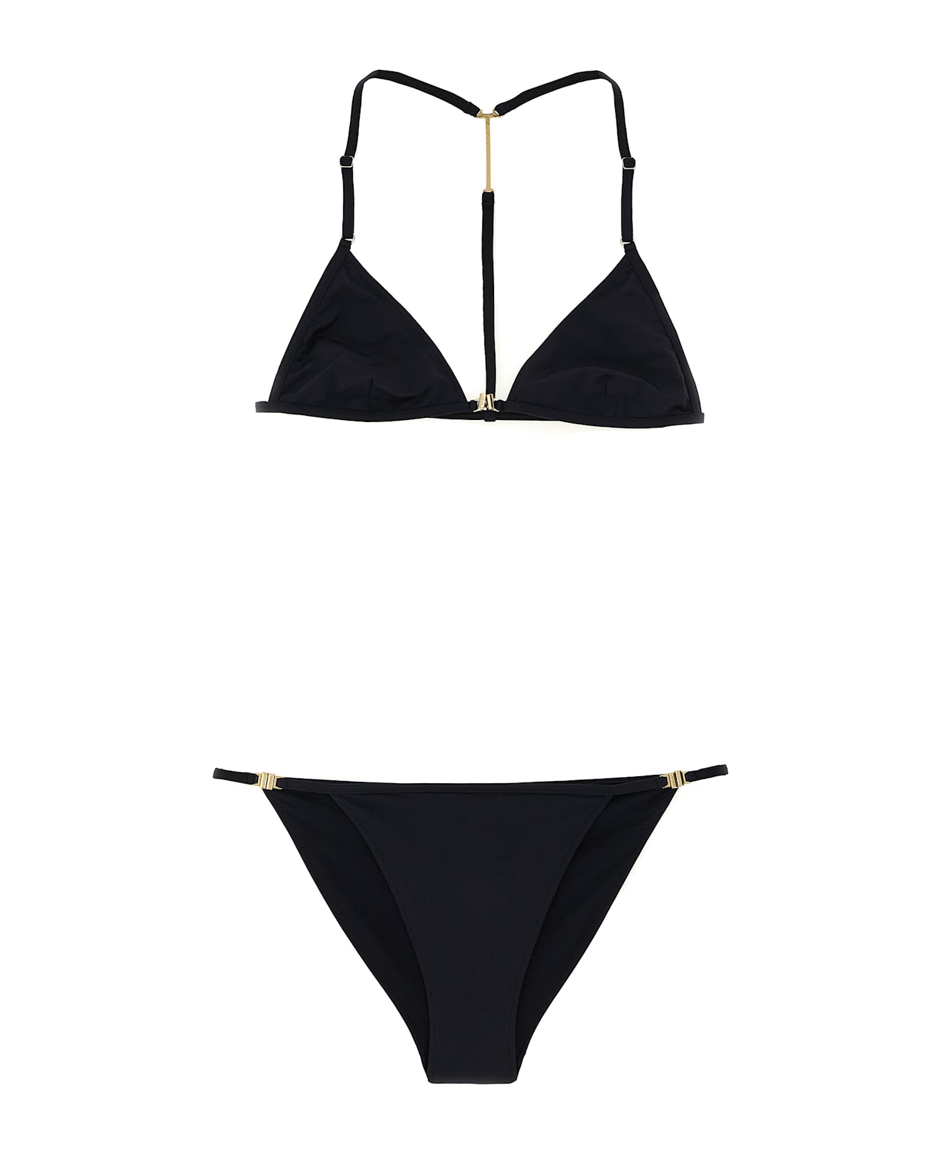 Stretch jersey bikini with triangle top with front hook closure and metal 'T' detail in the middle of the back, briefs with medium coverage and side hook closures. Composition: 74% polyamide, 26% elastane