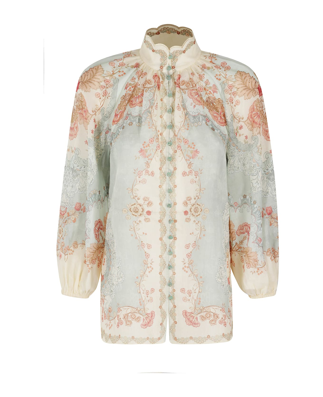 Category: Tops Item: Daylight Blouse Brand: Zimmermann Color: Mint green Collar: High Detail: All-over floral print Closure: Front buttons SIZE AND FIT Fit: RIlassed Sleeve Length: Long balloon