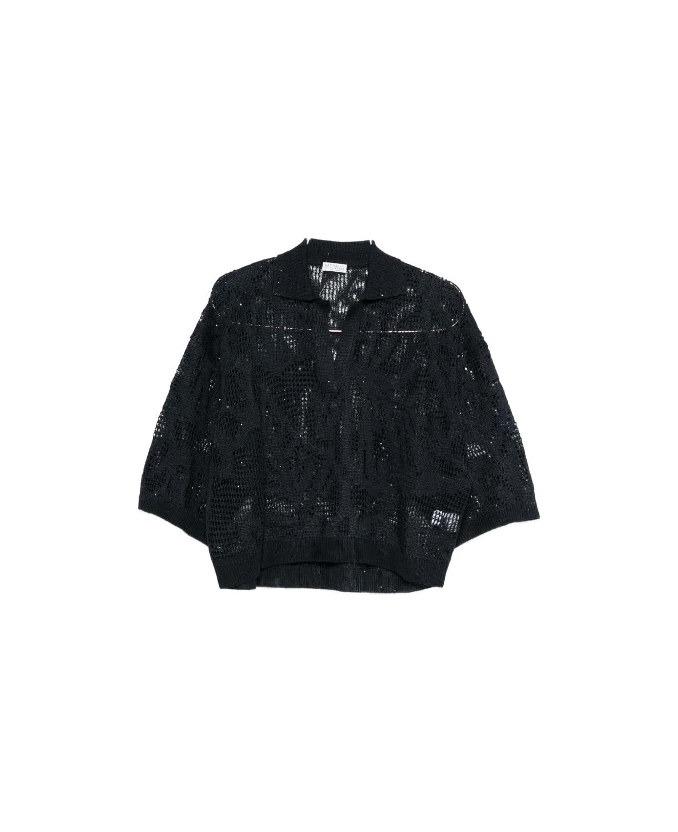 dark blue open knit V-neck half sleeves sheer polo collar Composition: 94% Linen, 6% Cotton
