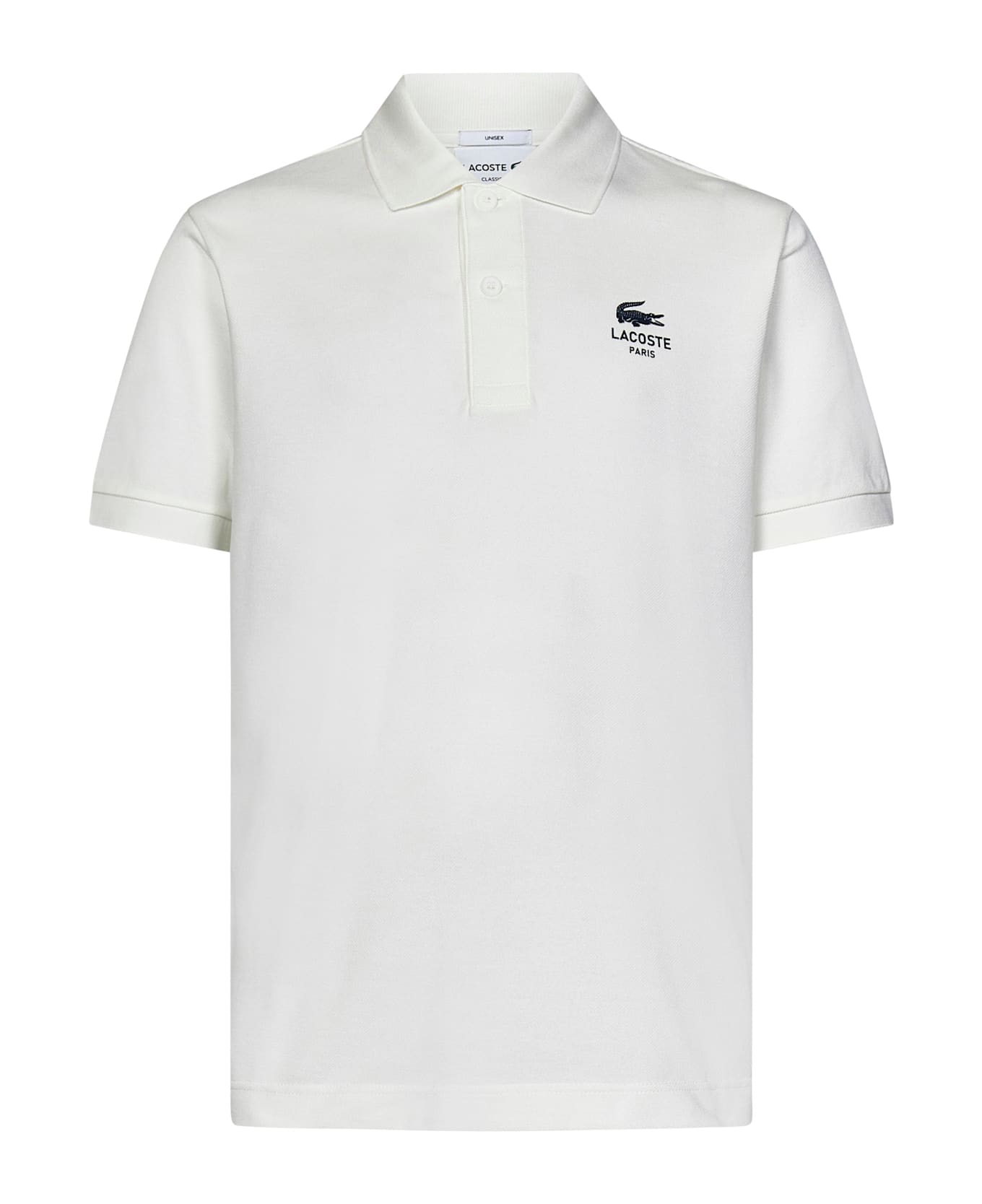 Composition: Front Two-button Closure, Tone-on-tone Rubber Buttons Ribbed Polo Collar; Short Sleeves, Ribbed Cuffs Contrasting Crocodile And Logo Lettering At Chest; Crocodile Badge Embroidered At Back Unisex Classic Fit White Color , 100% Cotton Made In France