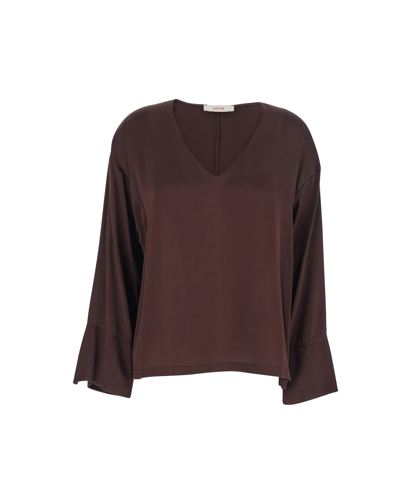 Brown Silk Blouse With V Neck And Long Wide Sleeves Woman