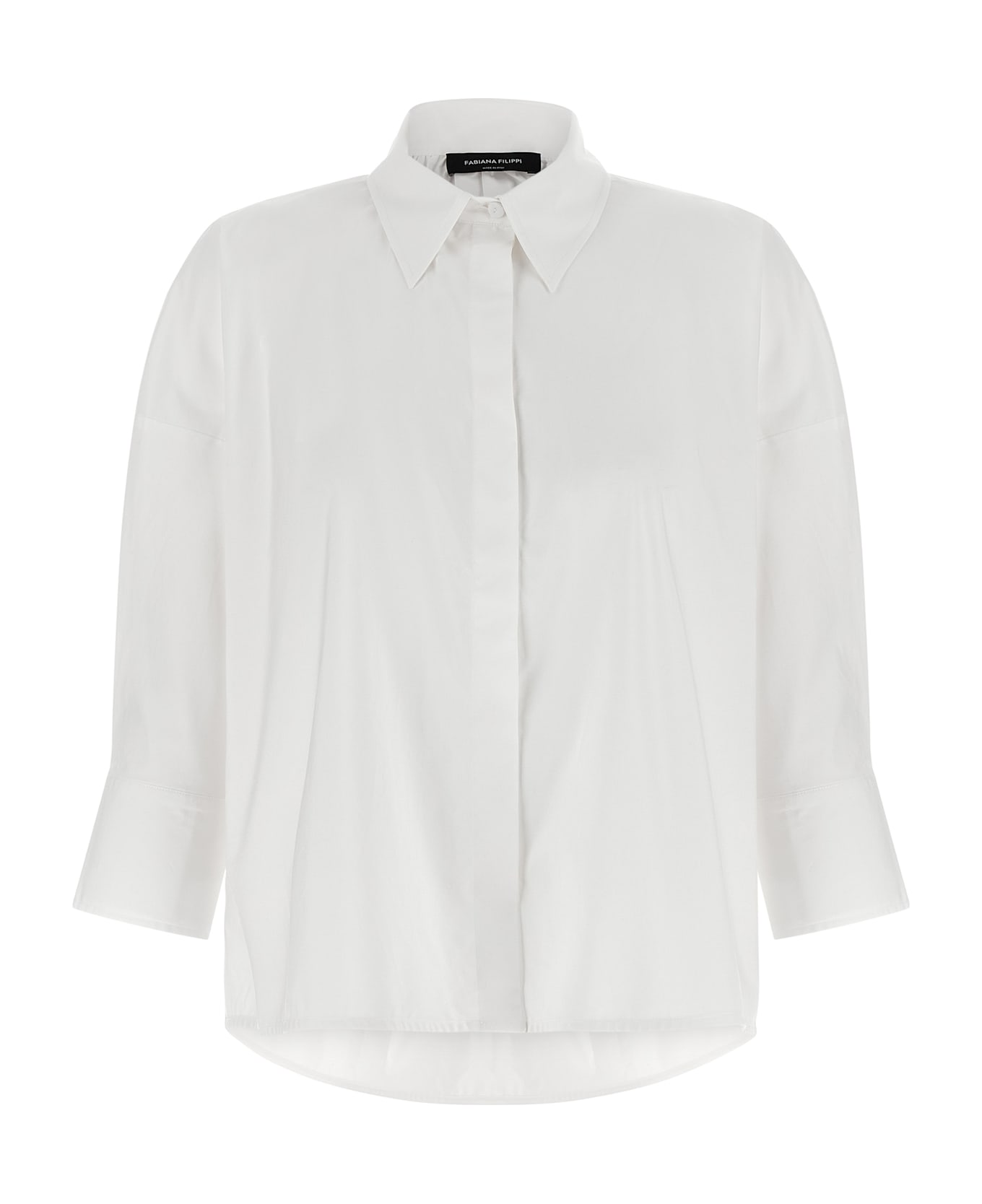 Cotton poplin shirt with back tulle and diamond thread inserts, concealed front button closure, 3/4 sleeves with cuffs and dropped shoulder, side slits, asymmetrical hem. Composition: 100% cotton