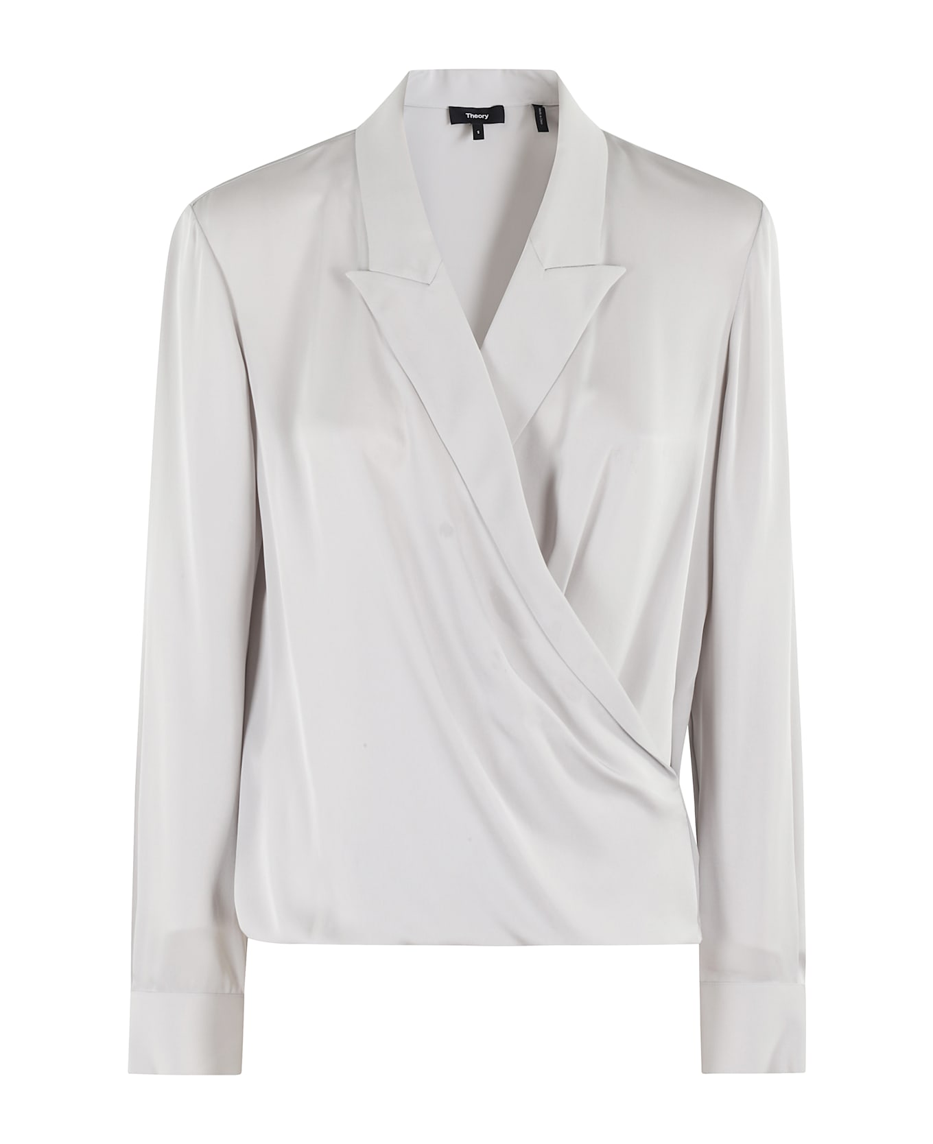 Lapel Wrap Blouse - Theory - gray color - 100% silk - v-neck - lapels - front crossover - button cuffs - regular fit