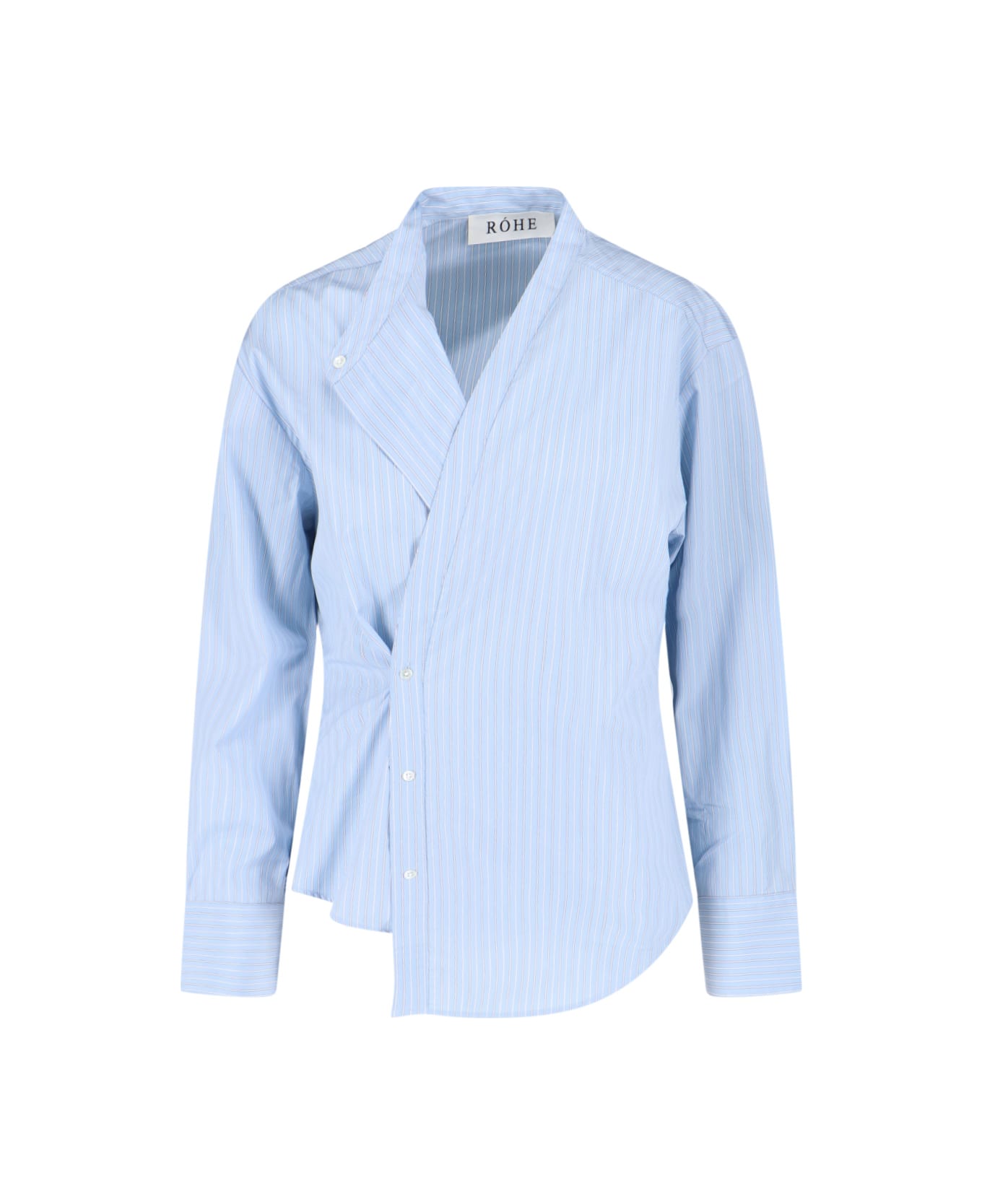 Róhe striped asymmetric shirt in light blue cotton with striped pattern, asymmetric neckline, asymmetric button closure, button cuffs, and asymmetrical hem.