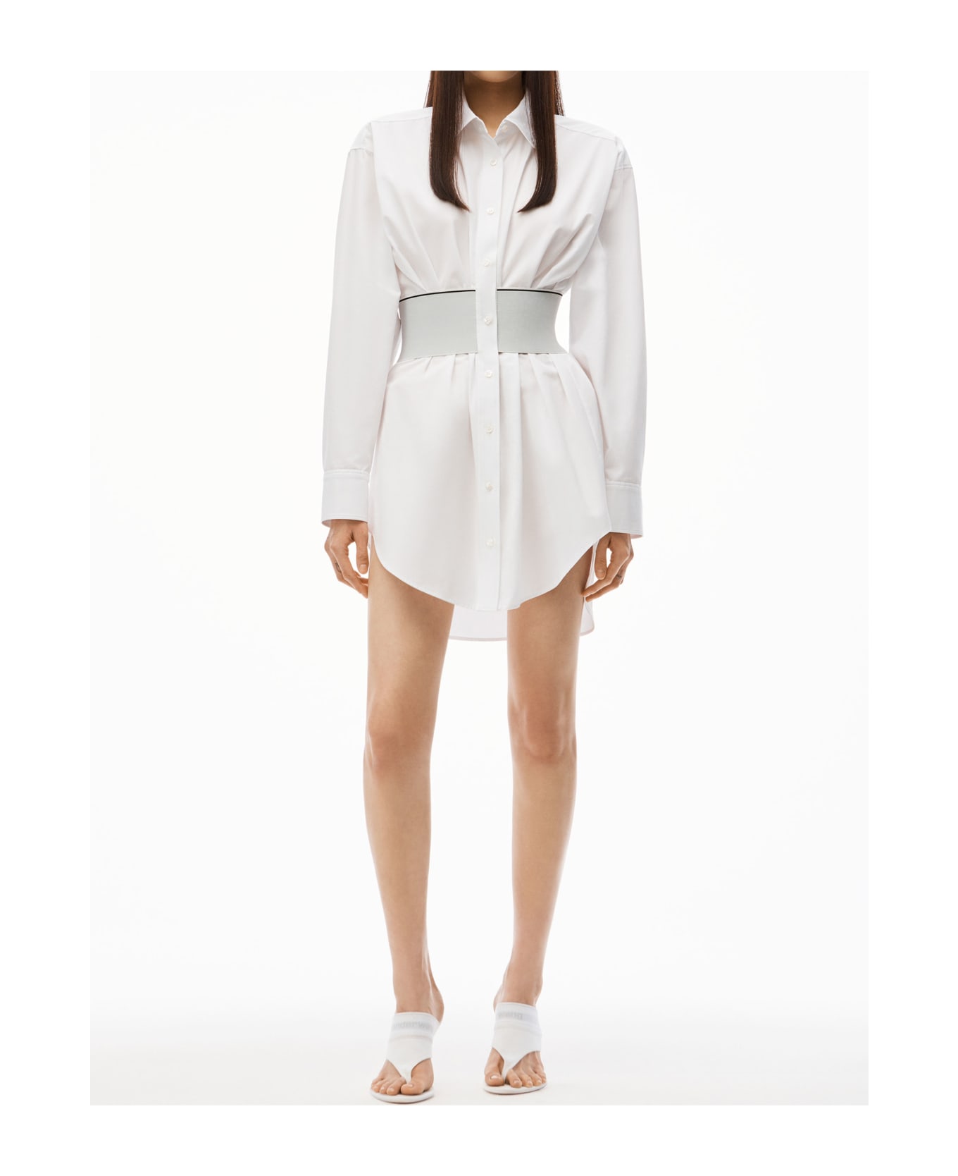 Shirt dress in white cotton poplin with cinched elastic Alexander Wang logo band waist. It features front button front closures with hidden zipper at center front placket and relaxed shoulders. Relaxed fit.