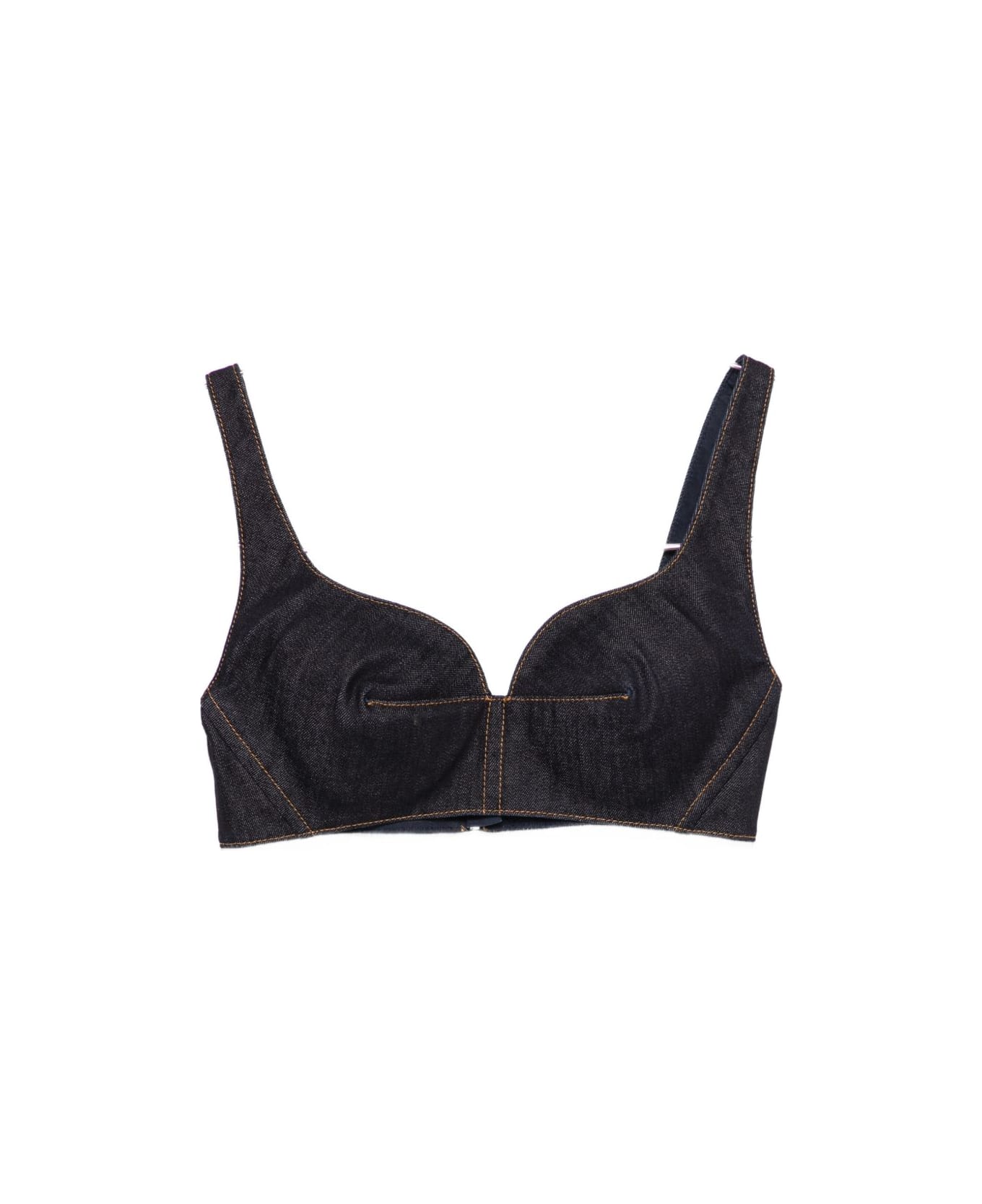 Raw denim bra top with contrasting stitching, zip and hook closure at the back. Composition: 98% Cotton, 2% Elastane