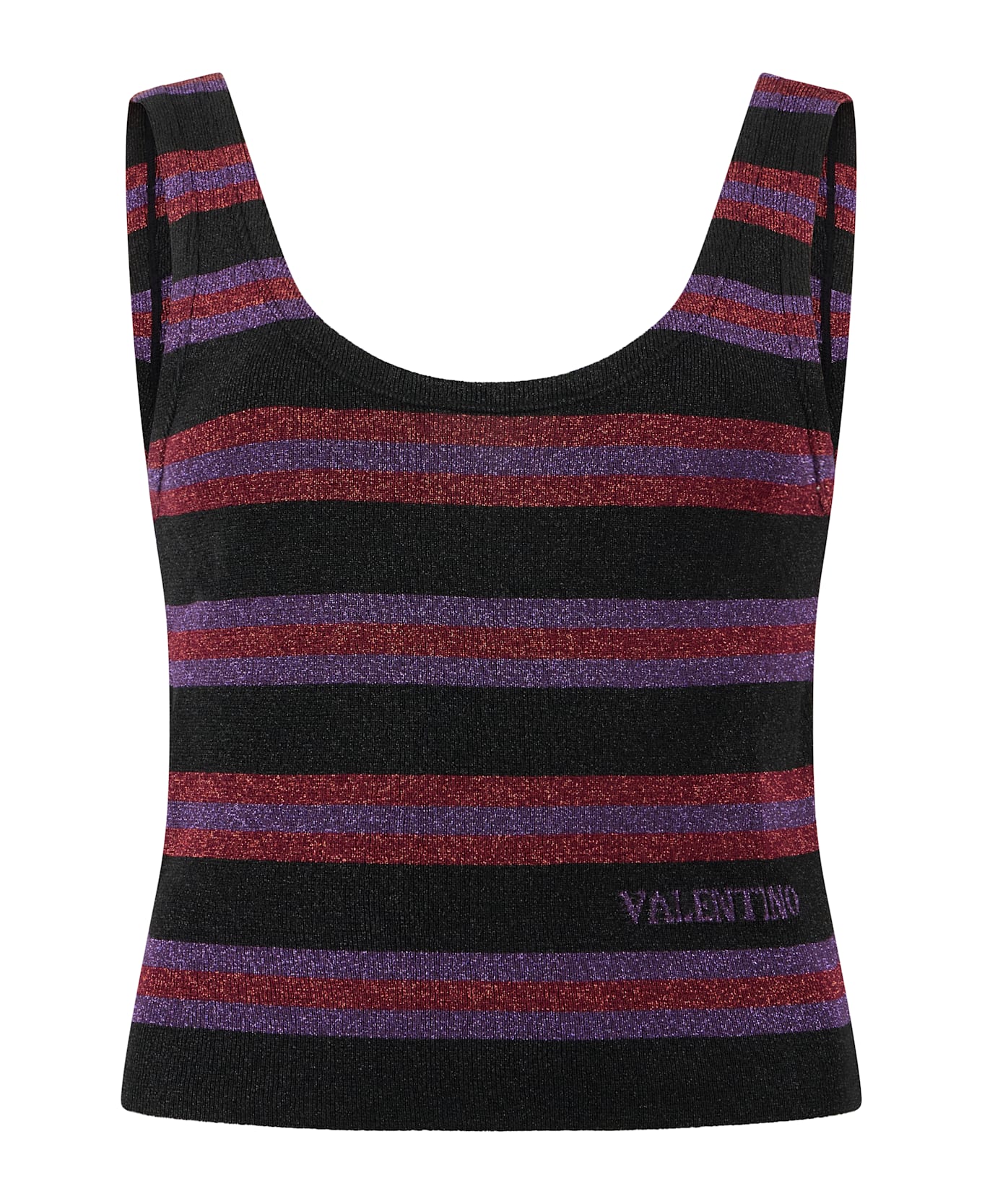 Top sleeveless made of lightweight fabric, featuring a body-hugging fit. it has a striped pattern in shades of black, burgundy, and purple. the wide neckline and wide straps ensure comfort and freedom of movement, making this piece ideal for a casual and versatile look. perfect to match with jeans or skirts for an informal outfit. 82% vi, 16% mz, 02% polyester Composition: 82% % Vi, 16% % Mz, 2% % Polyester
