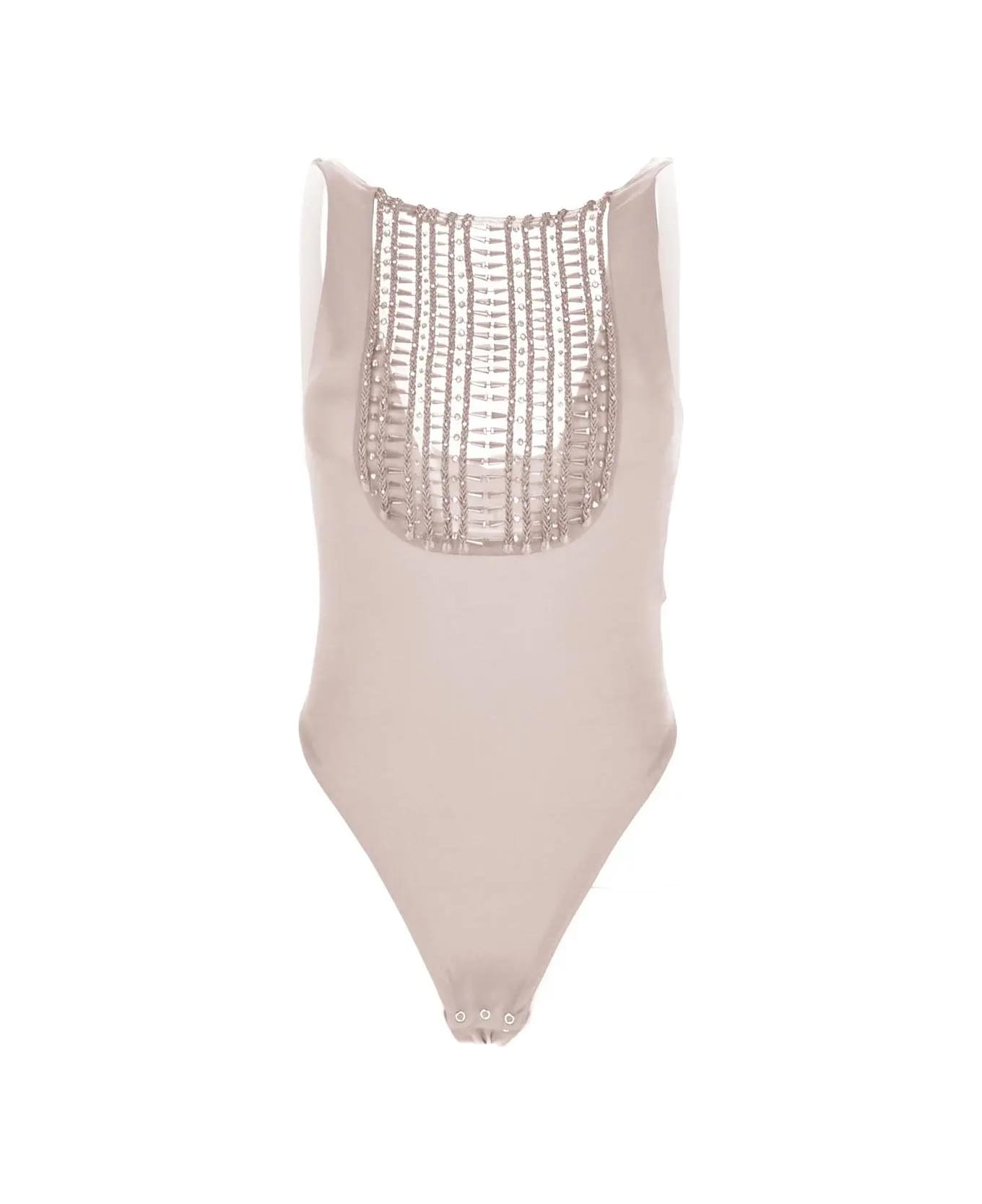 Elisabetta Franchi bodysuit in shiny butter polyamide lycra with embroidered ascot tie, sleeveless, round neck, wide U-neckline at the back and snap button closure.