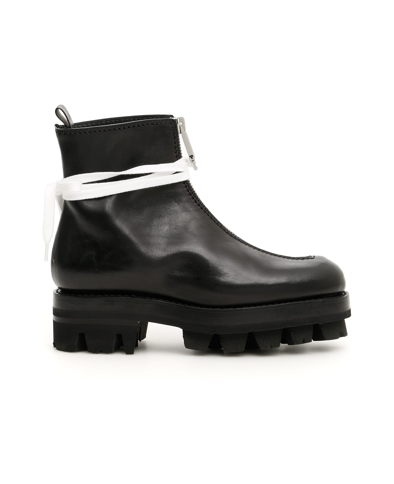 Alyx leather boots with front zip closure and silver-tone metal zip puller. Back loop, removable decorative lacing, leather lining, chunky rubber sole.