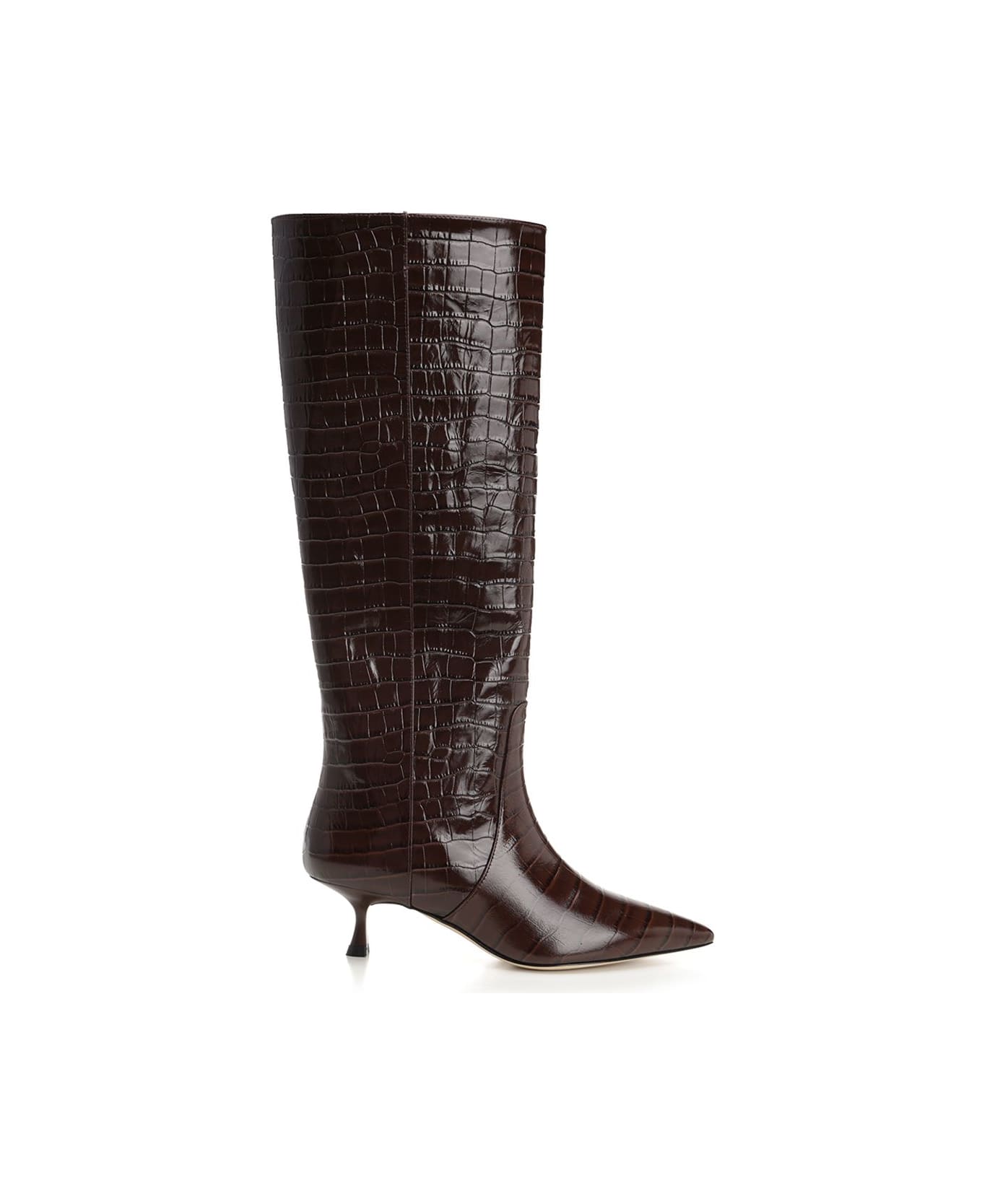 "Naomi 50" pointed knee high boots by Stuart Weitzman in chocolate brown. 50mm heel.