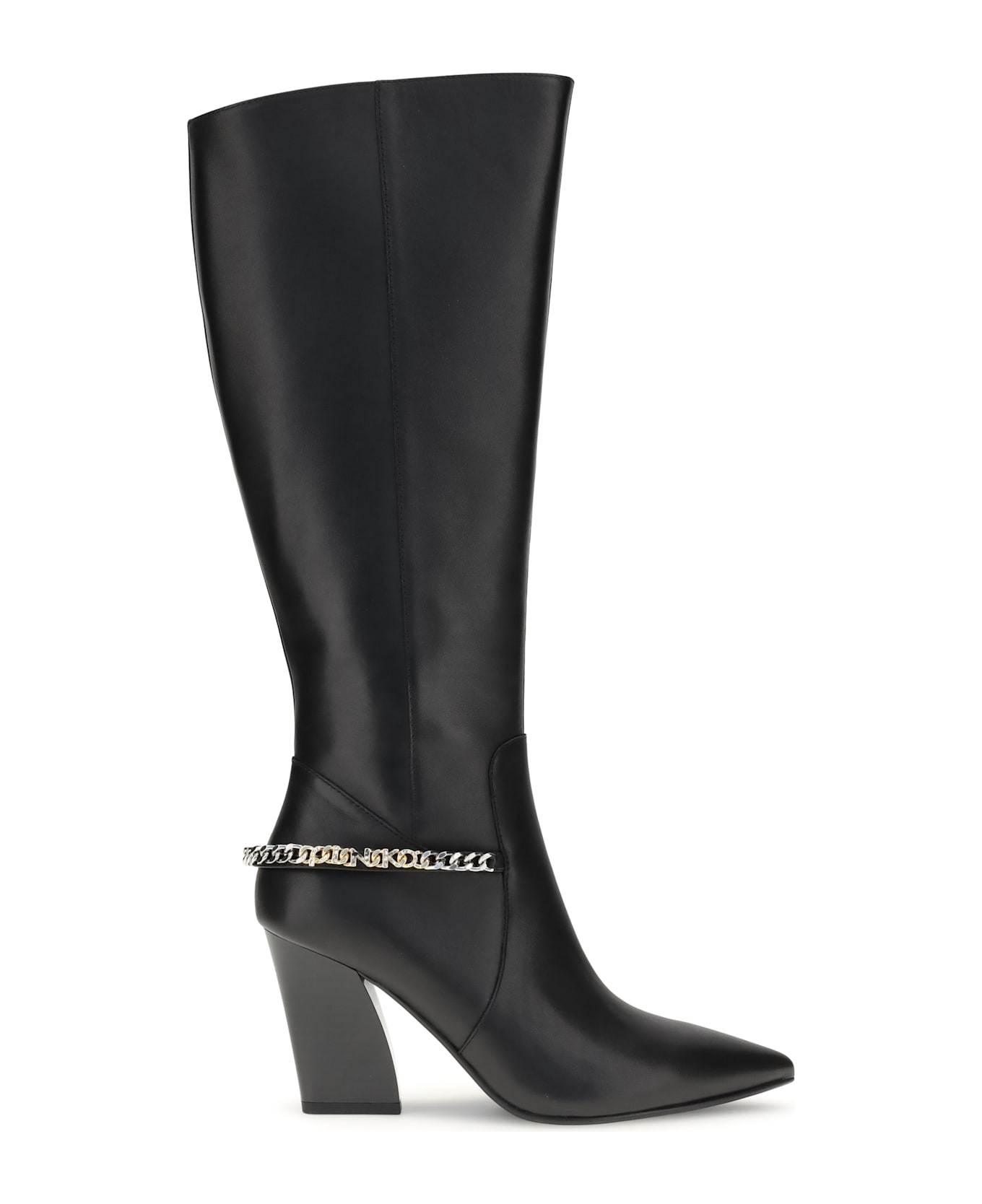 Pinko's viola high boots are made of nylon and feature a modern, punchy design. the tapered toe slims the silhouette, while the asymmetric heel gives an original touch. on the side, a logo chain adds an iconic detail, complemented by the side zipper that ensures practicality. ideal for a bold, contemporary style.