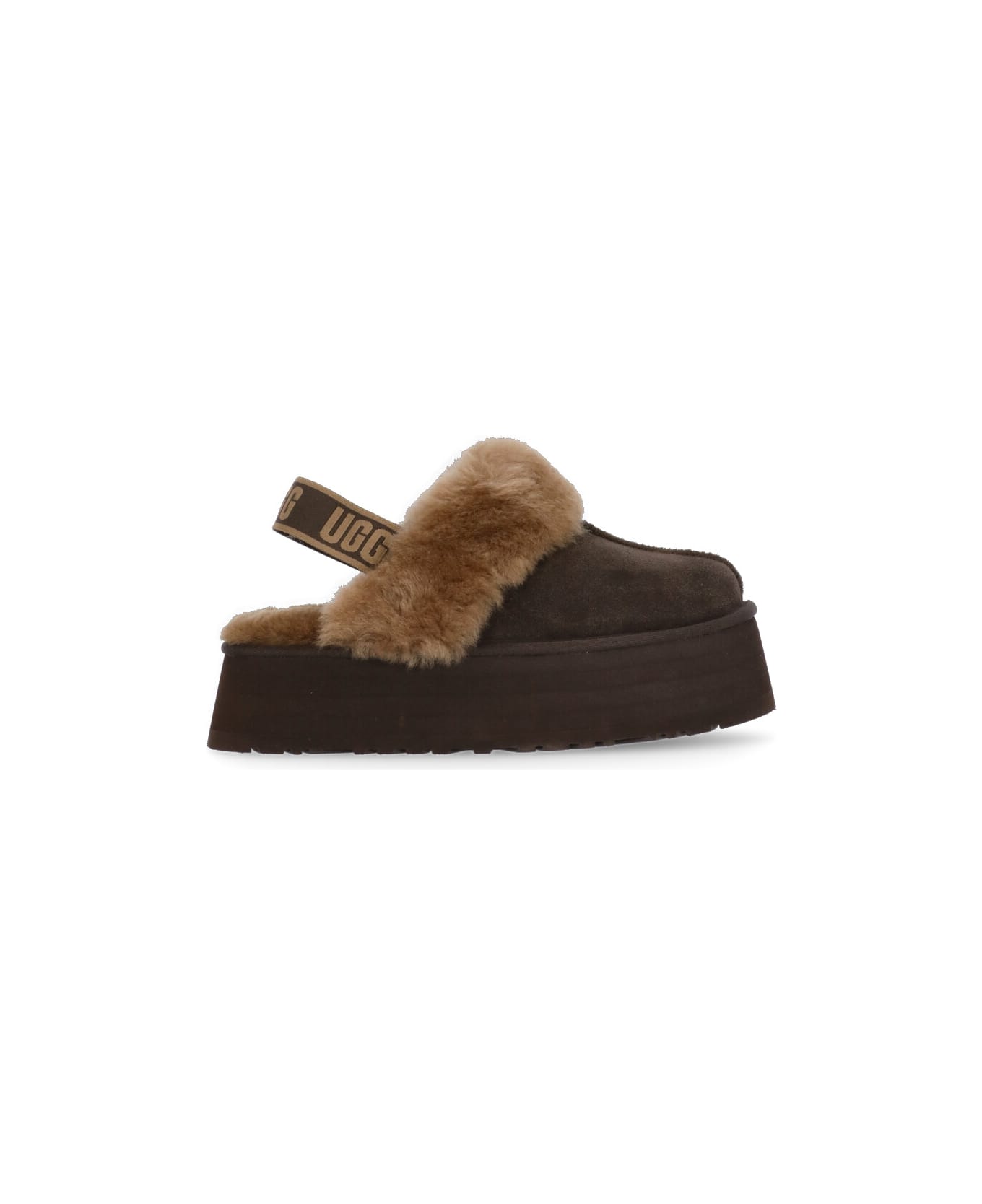 - Dark brown UGG suede leather woman's slippers - Round toe - Front Contrasting color sheerling fur - Rear logoed elastic - Contrasting color shearling interior - Rubber platform sole (4 cm)