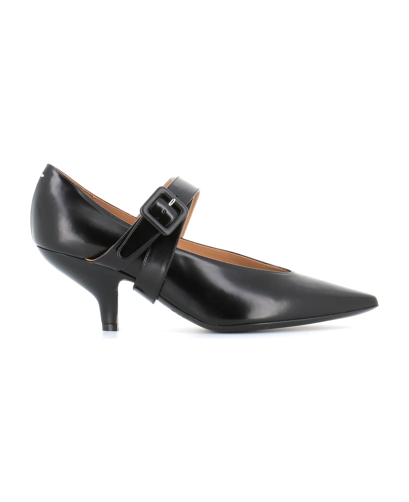 Black brushed leather Décolleté Mary Jane from Maison Marigela, featuring by tango-inspired toe and adjustable double-wrap strap with buckle. Lined interior. Leather sole. Heel to spool: 6,5 cm Composition: Leather