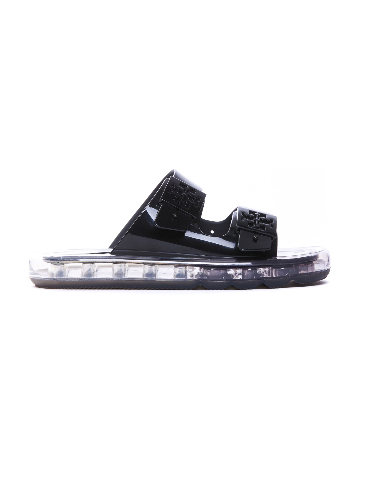 Tory Burch black Buckle Bubble Jelly sandals, round toe, lateral buckles logo closure, transparent effect
