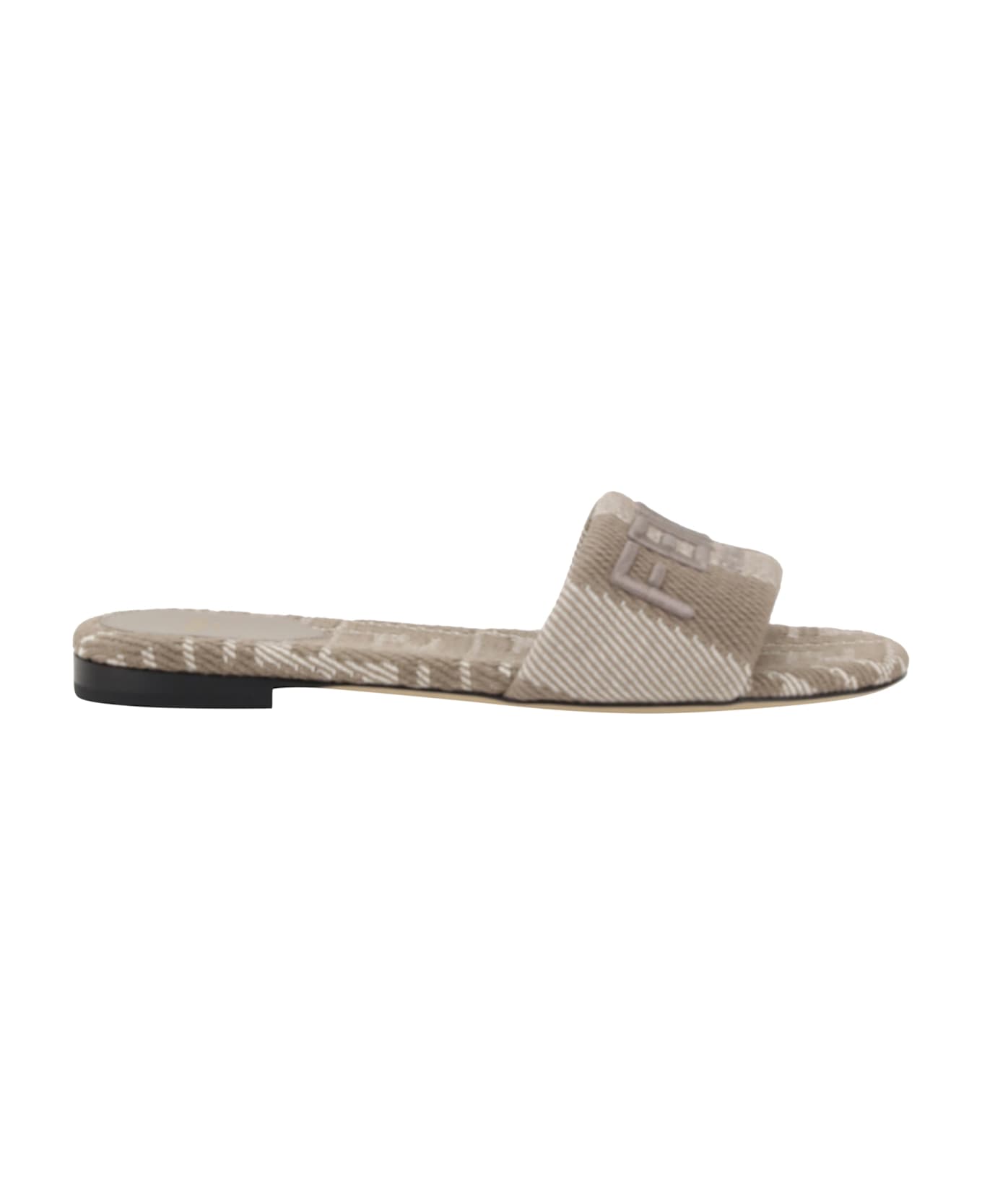 Fendi's sandals feature a round toe and all-over repeated ff jacquard weave, giving them an elegant and distinctive look. the iconic fendi monogram is embroidered on the front strap, adding a detail of luxury and recognition. the flat sole ensures comfort while walking, while the logoed insole completes the design with a touch of the brand's authenticity and style.