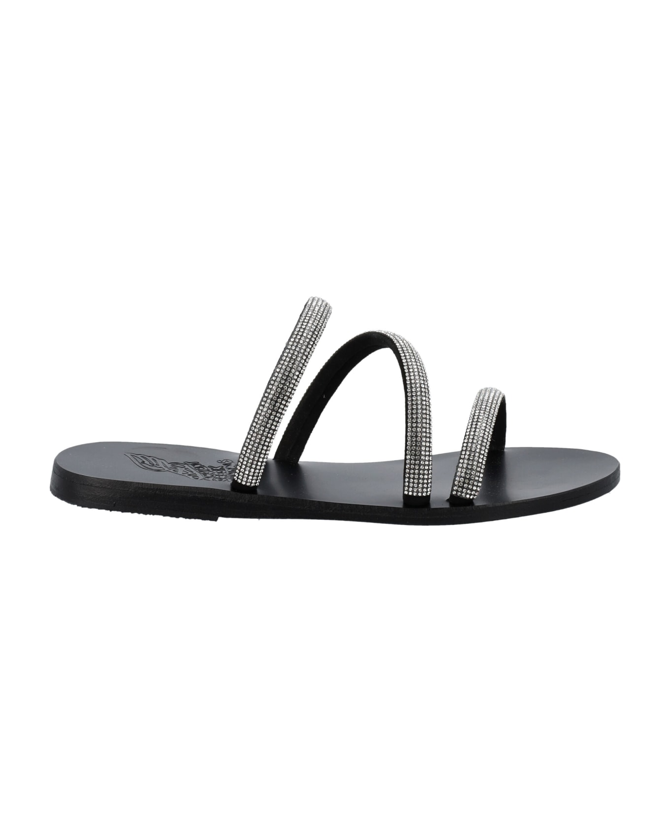 Black Leather Polytimi Diamante Sandal By Ancient Greek. Featuring: - Slip-on Style - Open Toe - Round Toe - Three Crystal Embellished Straps - Branded Black Leather Sole - Flat Sole
