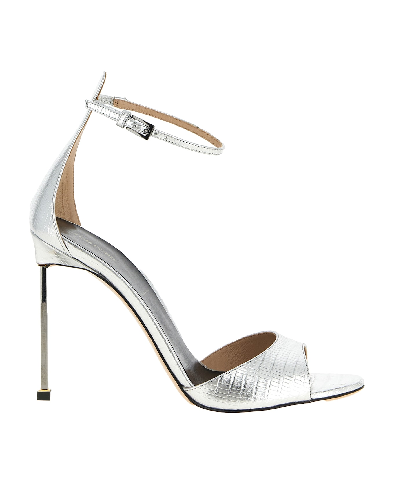 'Tejus' snake print laminated leather sandals, adjustable ankle strap, square metal stiletto heel, leather sole.
