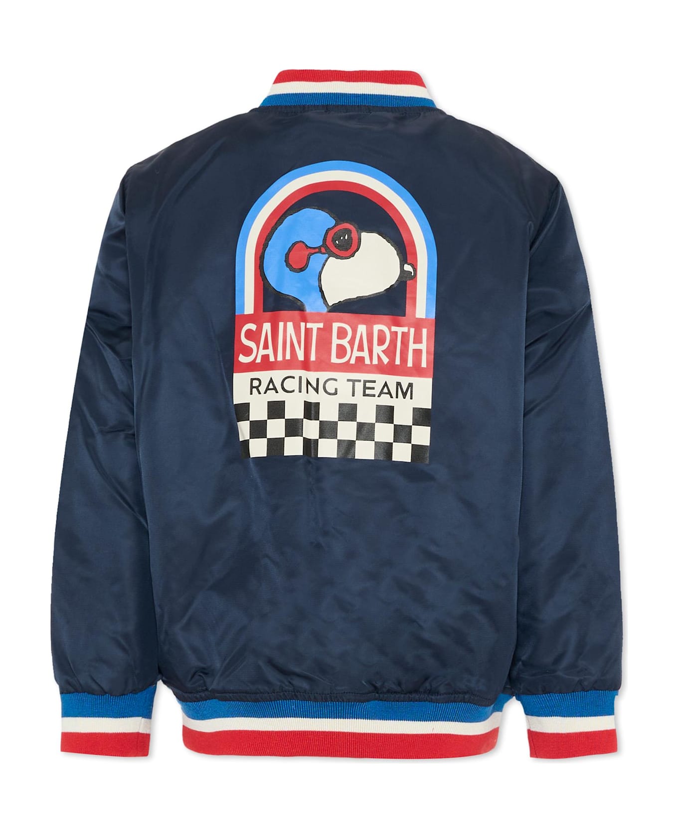 Lightly padded blue jacket with long sleeves, a low striped knit collar, a snap button front, side pockets, and ribbed cuffs and hem. It is embellished with a Snoopy print on the back and a logo patch on the chest.