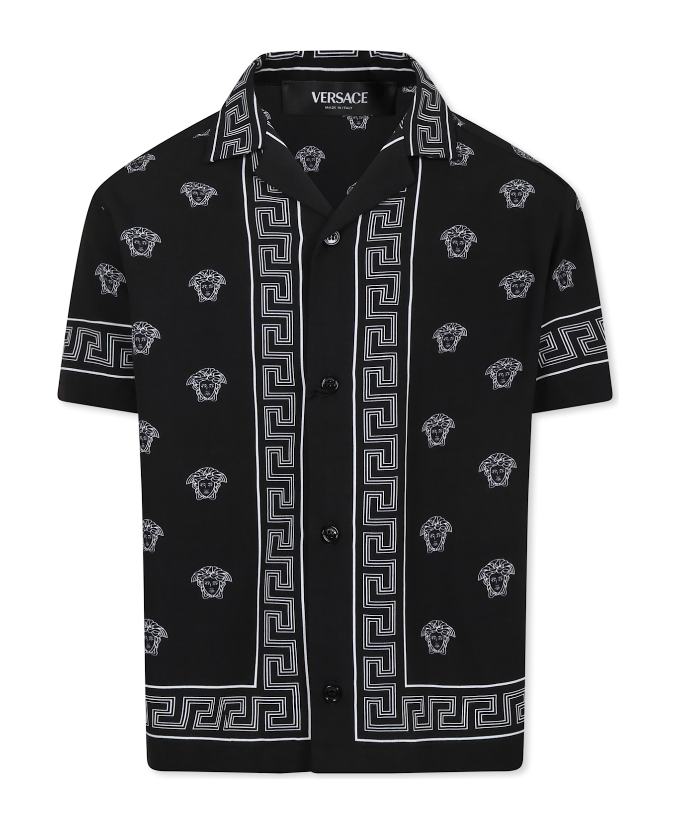 Black shirt from the luxury brand Versace, with short sleeves, lapel collar and front button closure. It is embellishd with a bandana print in the style of Medusa and the iconic Greek key.