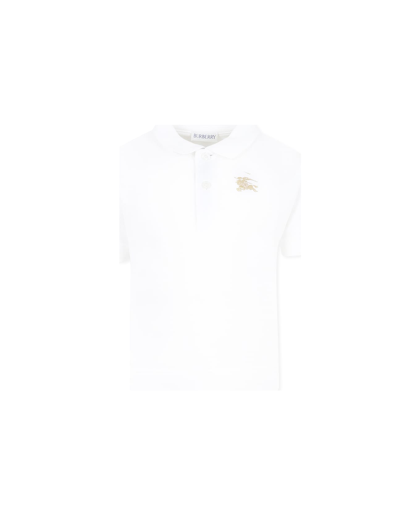 White polo shirt from the luxury brand Burberry made of cotton, with short sleeves, collar and button closure on the front. It is embellished with an iconic beige logo embroidered on the chest.