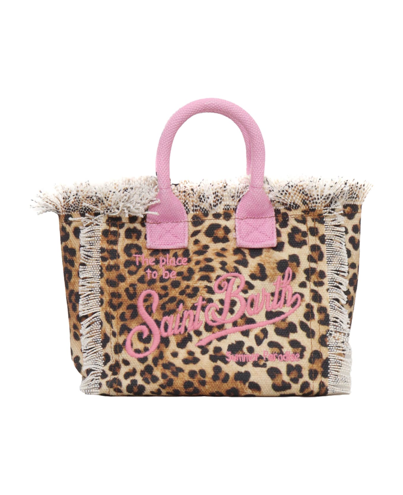 Mini-sand leopard-print cotton bag with contrasting pink fringes, handles and shoulder strap. Composition: 100% COTTON
