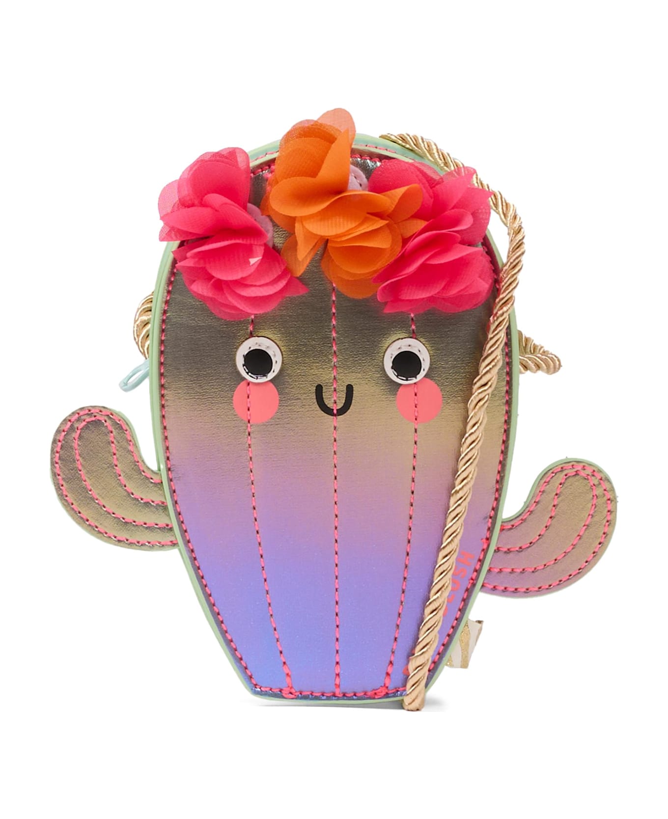 Multicolored cactus-shaped bag with braided shoulder strap and top zip closure. It is decorated with mesh flowers on the front.