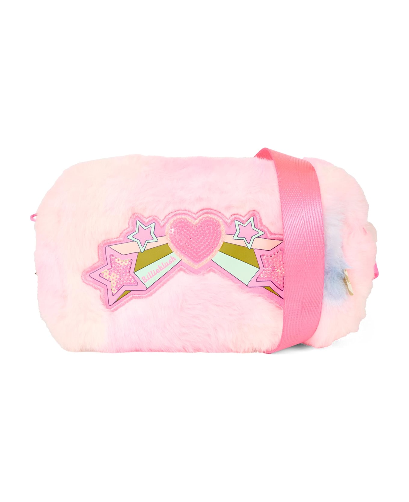Pink faux fur pencil case, with removable shoulder strap and top zip closure. It is embellished with lurex stars.