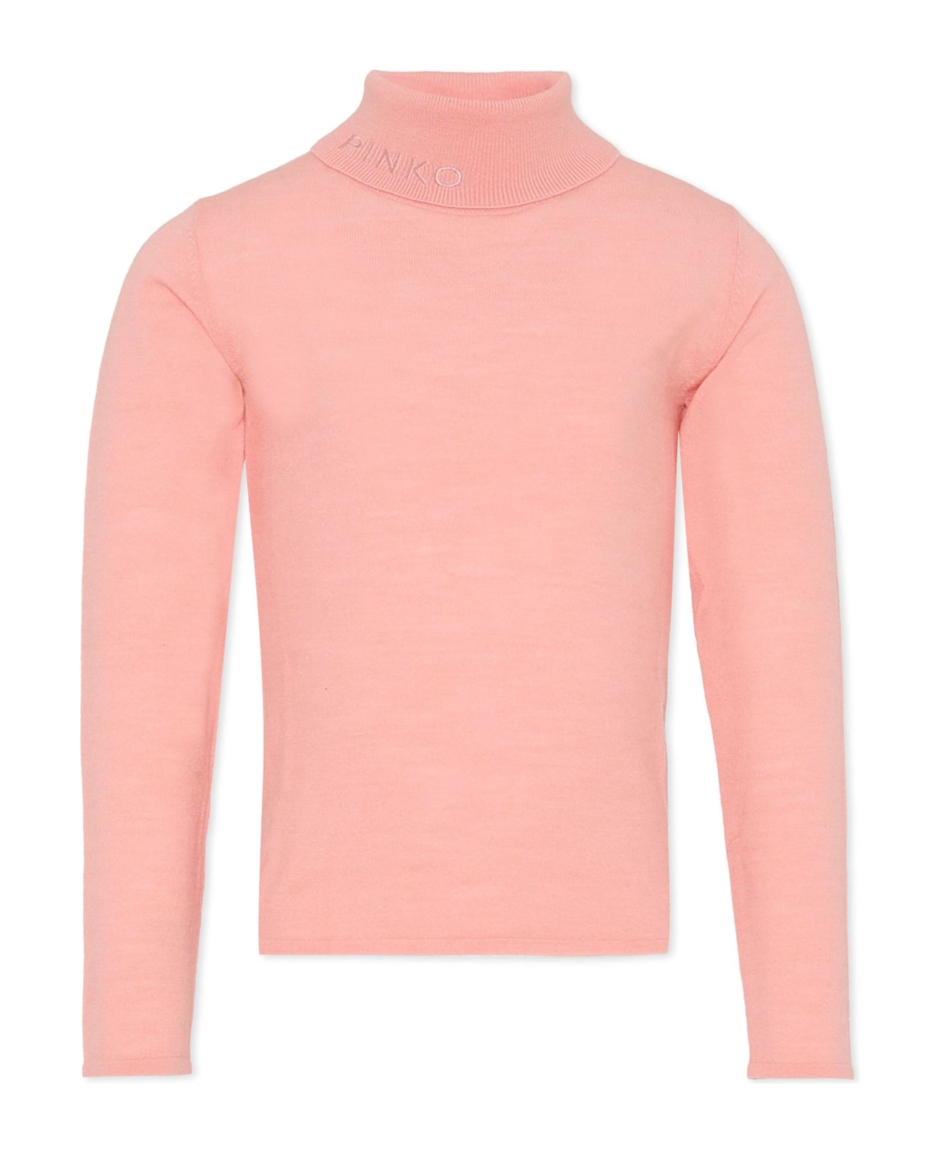Pink blend turtleneck sweater with long sleeves and a high neck. It is embellished with an embroidered logo on the neck.