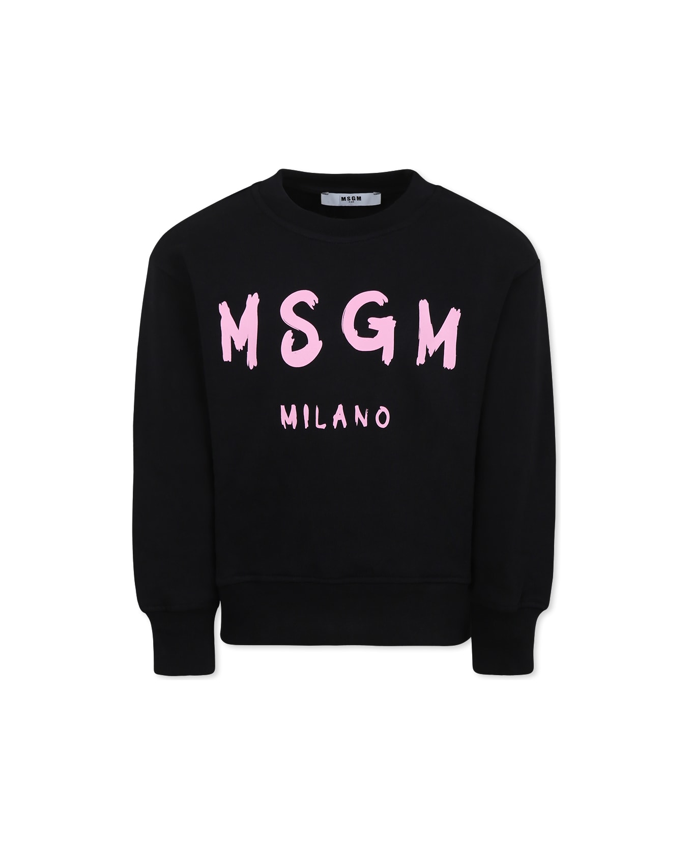 Black sweatshirt in brushed cotton, long sleeves, with ribbed crew neck, cuffs and hem. It is embellished with pink MSGM Milano logo printed on the front.