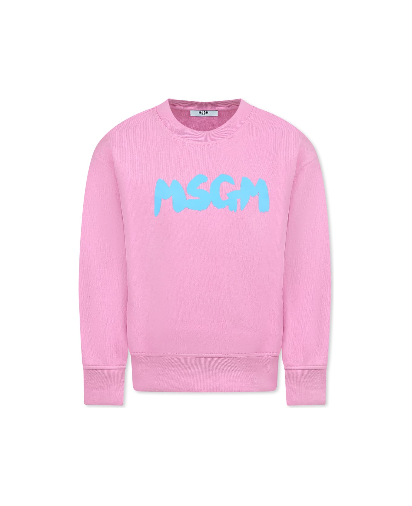 Pink sweatshirt in brushed cotton, with long sleeves, crew neck, ribbed cuffs and hem. It is embellished with light blue logo on the front.
