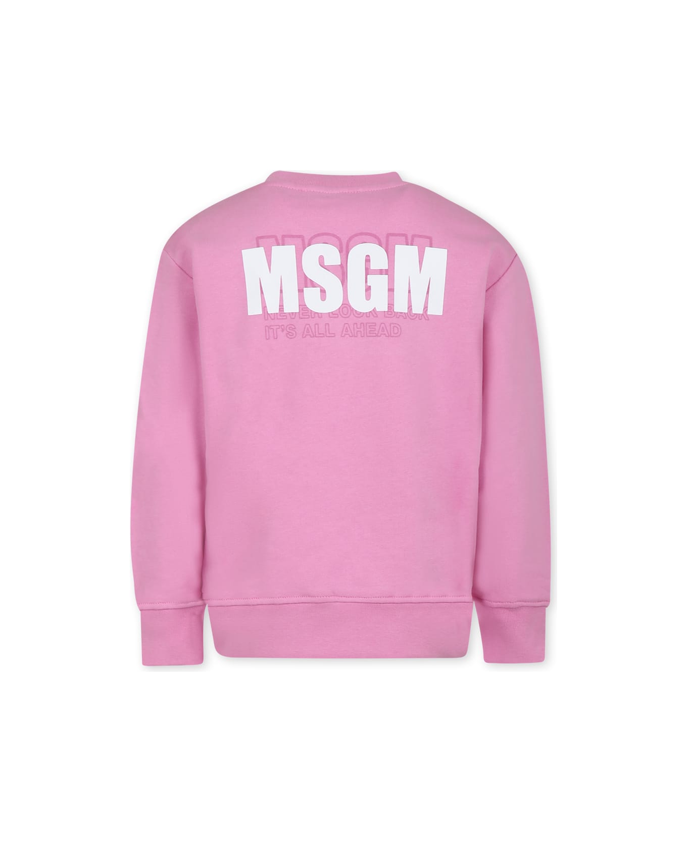 Pink sweatshirt in brushed cotton, long sleeves, with ribbed crew neck, cuffs and hem. It is embellished with white MSGM logo printed on the chest and with logo and writing on the back.
