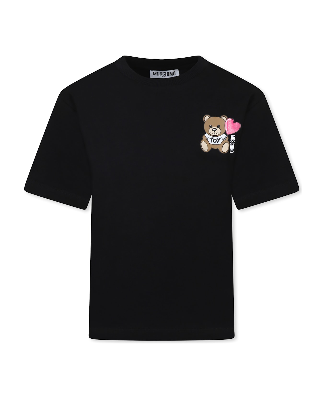 Black t-shirt from the Moschino Kids brand in cotton, with short sleeves and a ribbed crew neck. It is embellished with Teddy Bear, heart and logo on the chest.
