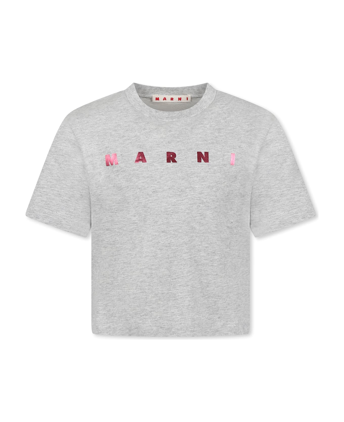 Grey crop T-shirt made of cotton, with short sleeves, crew neck and ribbed hem. It is embellished with metallic fuchsia logo on the front.