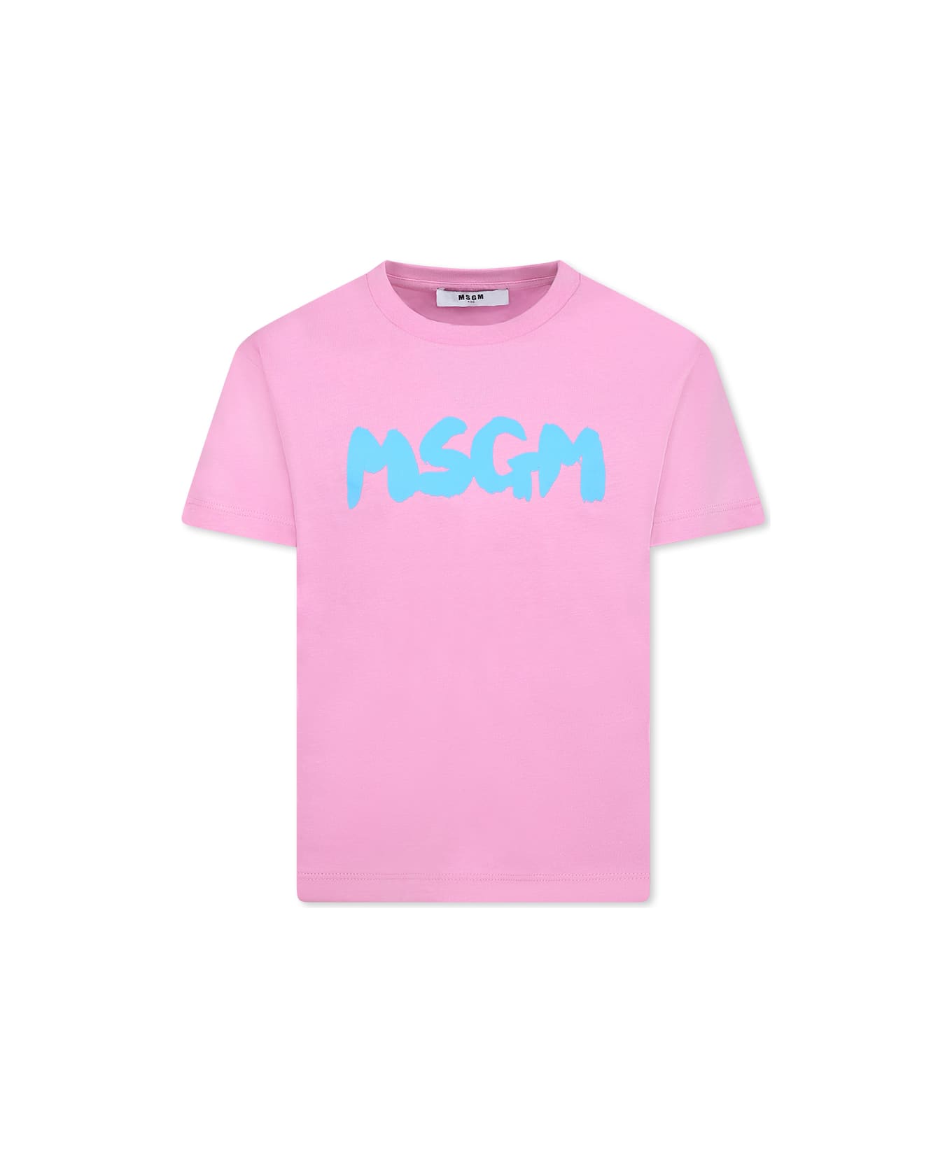 Pink cotton t-shirt, with short sleeves and ribbed crew neck. It is embellished with light blue logo on the front.