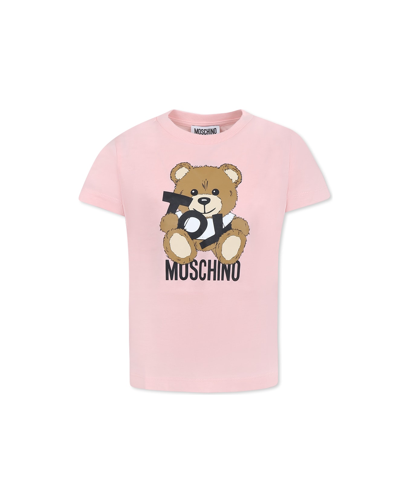 Pink t-shirt from the Moschino Kids brand, made of cotton jersey, with short sleeves and a ribbed crew neck. It is embellished with Teddy Bear, Toy writing and logo printed on the front.