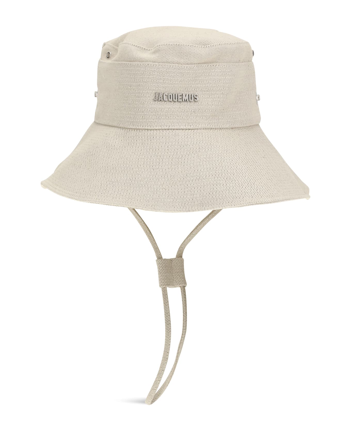 The le bob de-nimes bucket hat by jacquemus is a versatile accessory with a distinctive style. the long, adjustable strap allows for a personalized fit, while the stitched visor adds a touch of refined detail. the snap buttons on the sides and the circular and square drawstrings at the back give the model a unique character. the silver metal logo on the front completes the design with a discreet touch of luxury. perfect for those looking for a hat that combines practicality and contemporary style. Composition: 100% % Cotton