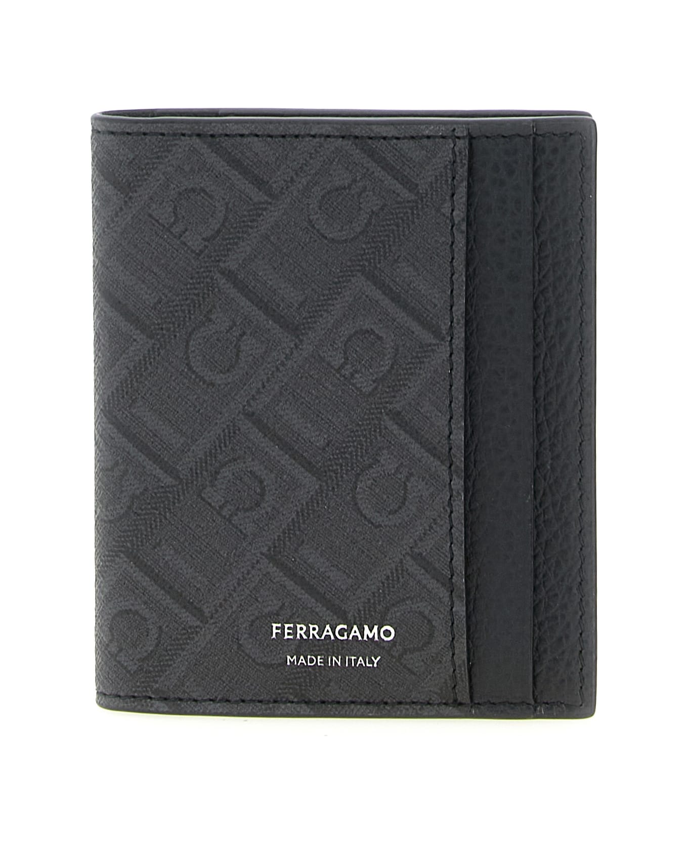 Card holder with hammered calf leather interior and external dials in coated fabric with 'Ferragamo Monogram' print, front logo print, and book opening. Composition: 90% fabric 10% calfskin leather