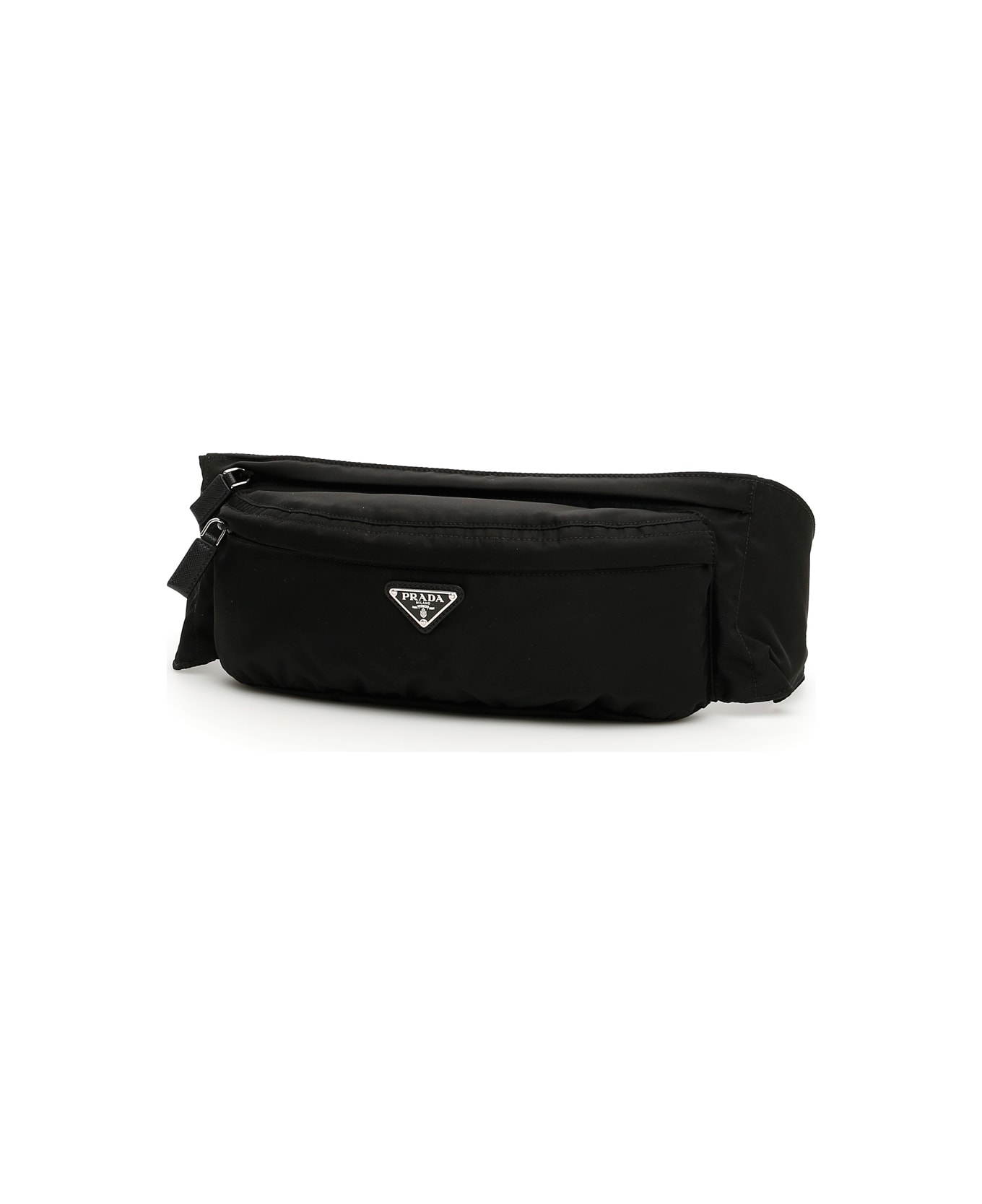 Prada nylon fanny pack with adjustable belt and logo metal buckle. Metal and enamel triangle logo, two zipped compartments, nylon lining. Shiny steel-finish metal hardware. Composition: 100% poliammide, 100% vitello