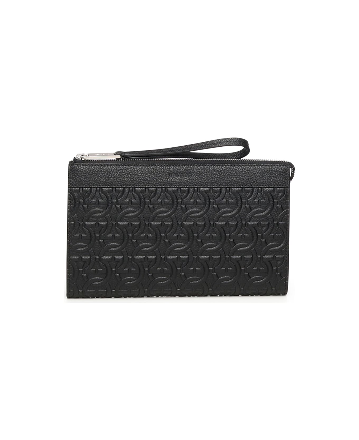- Made of embossed and hammered calfskin - Zip closure - Leather wrist strap - Made in Italy - Dimensions: 25 x 15. 2 x 3 cm - Color: Black
