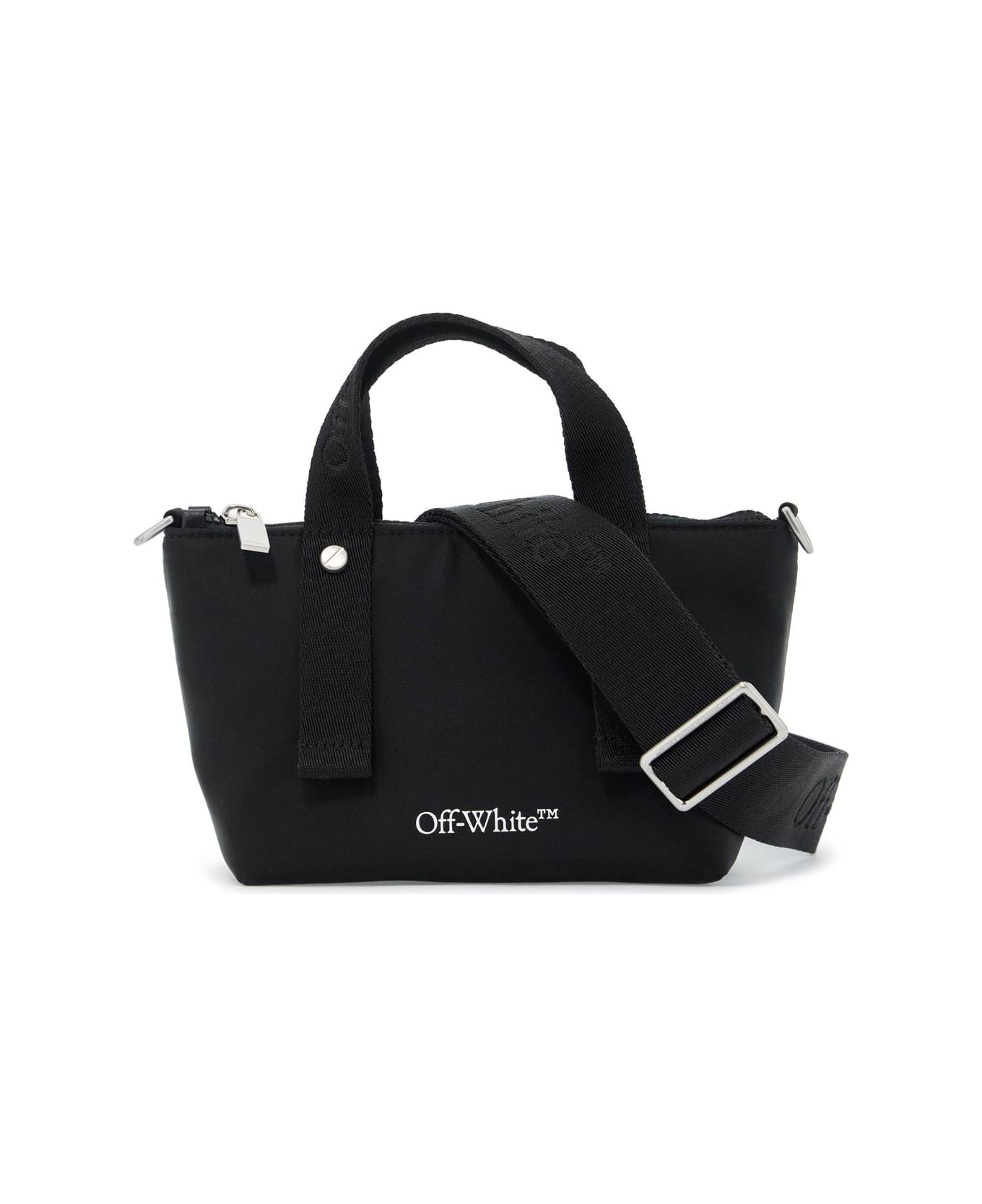 The Off-White Day Off mini tote bag is made of nylon with contrasting logo lettering and handles in woven tape with metal rivets. It features a zip closure, a lined interior with a leather card slot, and a removable and adjustable logotape shoulder strap. The metallic accessories have a steel finish.