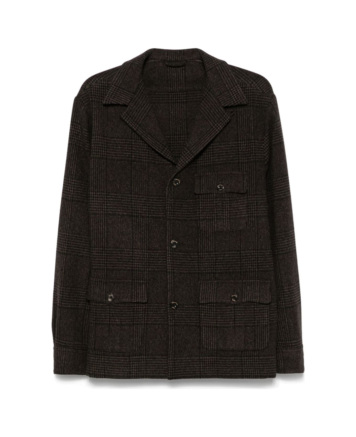 brown virgin wool blend check pattern front button fastening notched collar long sleeves buttoned cuffs chest flap pocket two side flap pockets straight hem